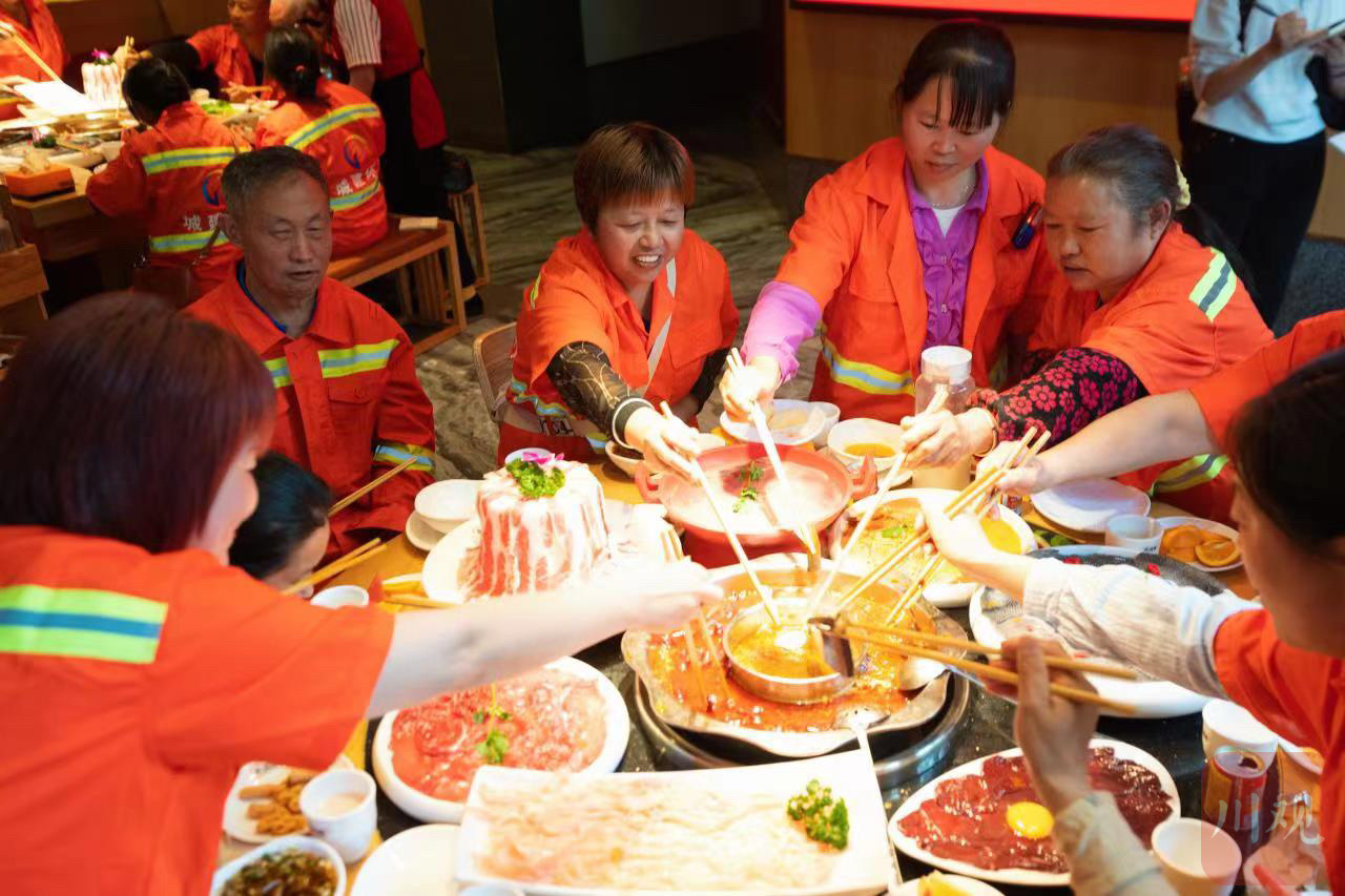 “好巴适!这次我们能在五一劳动节前夕聚在一起,和同事们吃上一顿暖心火锅,我感到非常开心和感动,在此我代表广大劳动者们向大家表示深深的感谢。”在现场的环卫工人代表说道。