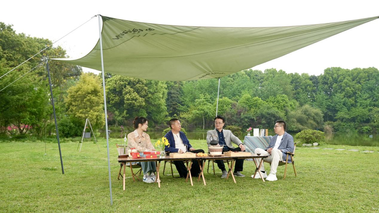 绿树环绕,曲径通幽,阳光为草地铺上了一层细碎的闪光滤镜;露营小椅,围坐煮茶,火苗温柔地煮着时光,茶色醇清茶香幽幽。