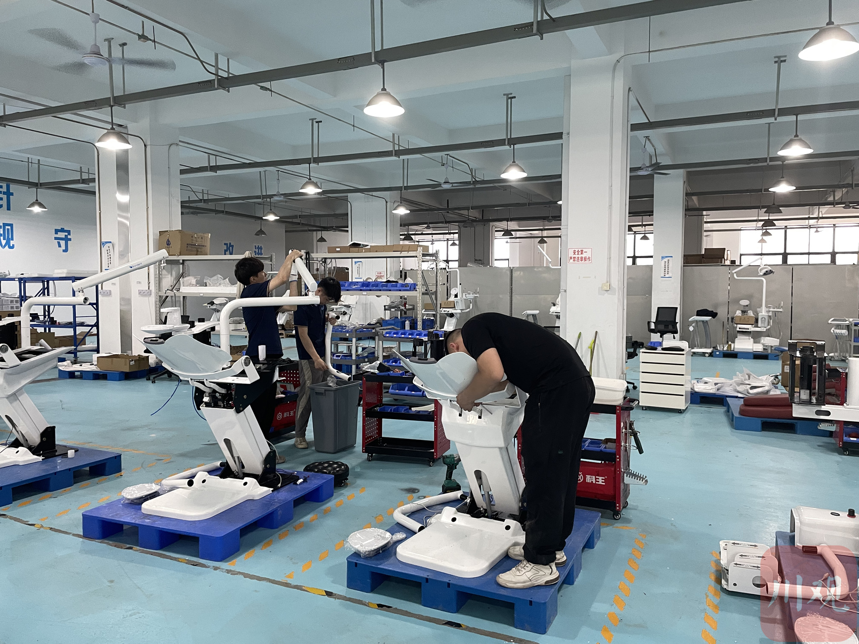在中国牙谷内的新骅光口腔产业园,聚集了包括牙易在线在内的10多家企业,涵盖了医疗器械制造、销售、电商平台服务等。沿着产业园办公楼往里走,四川贝利福医疗器械有限公司厂房内,工人们正在熟练操作机器,流水线上,一台台牙科种植机向前传送;四川牙易在线网络科技有限公司生产车间,大量“资阳造”口腔药品、耗材正从这里发往全国各地。