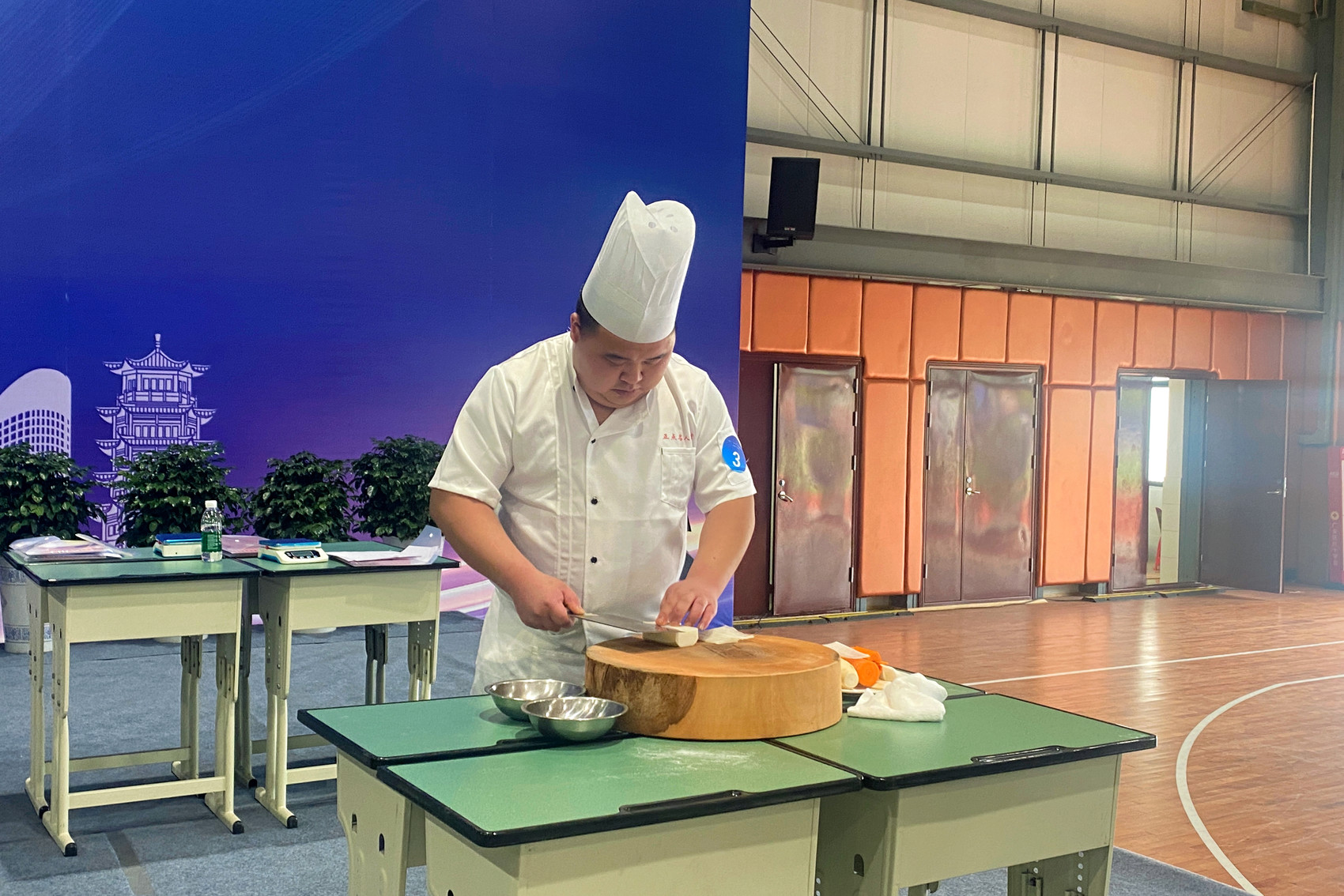 厨师刀工比拼竞赛上,参赛选手展示高超的刀工技艺。 吴迪 摄