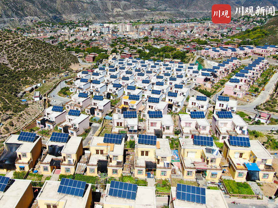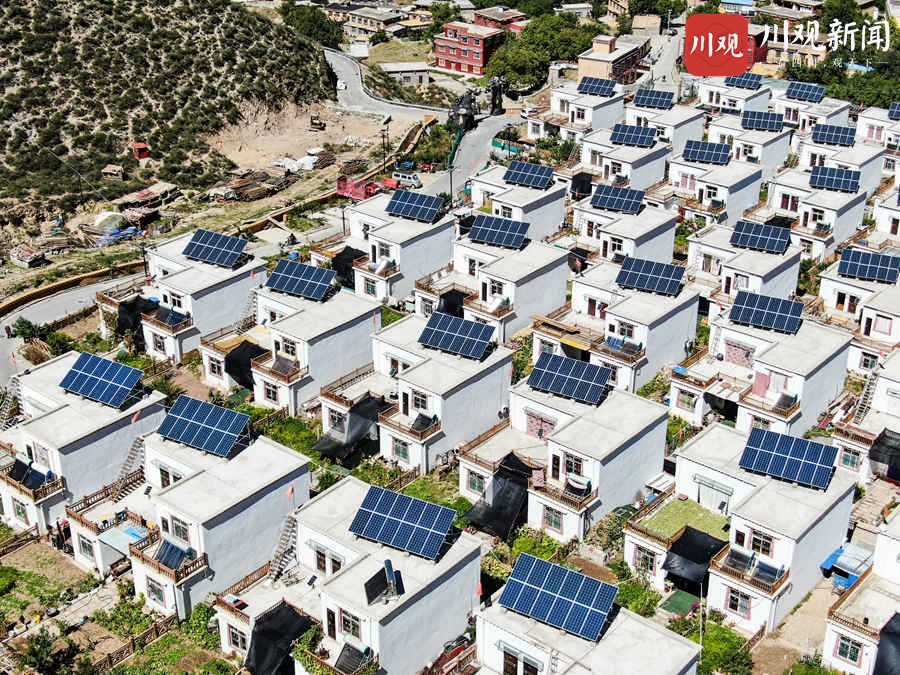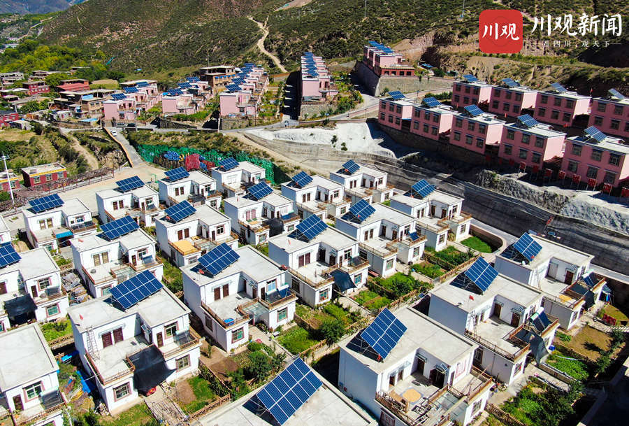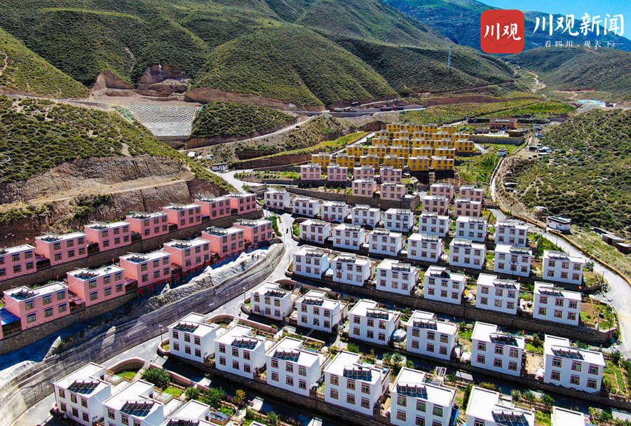 十月,记者来到巴塘县县城附近的一座新村,从无人机上看,山坡上的新村被三个颜色覆盖,在蓝天白云下线的格外美丽,它也有个诗意的名字,“桃源地坞”。