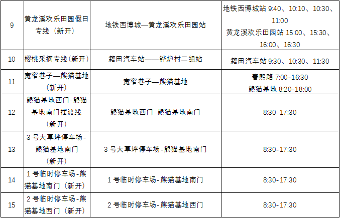 成都公交在现有的3条熊猫基地旅游线的基础上,新增4条熊猫基地摆渡线、1条熊猫基地旅游线,特别在游客出行高峰断面(6:30-14:00)较往年增投50%运力,以满足“五一”期间游客前往熊猫基地的“看猫”热情。
