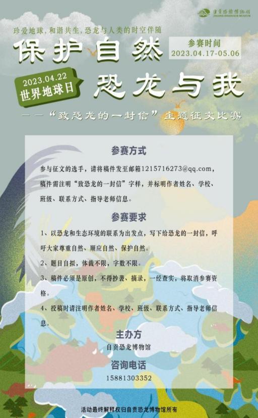 参赛方式:参与征文比赛的选手,请将稿件发至邮箱1215716273@qq.com,稿件需注明“致恐龙的一封信”字样,并标明作者姓名、学校、班级、联系方式、指导老师信息。