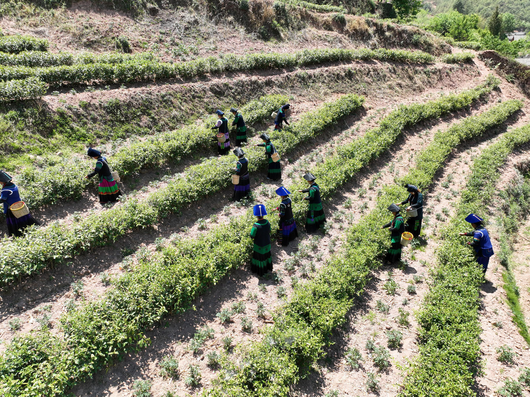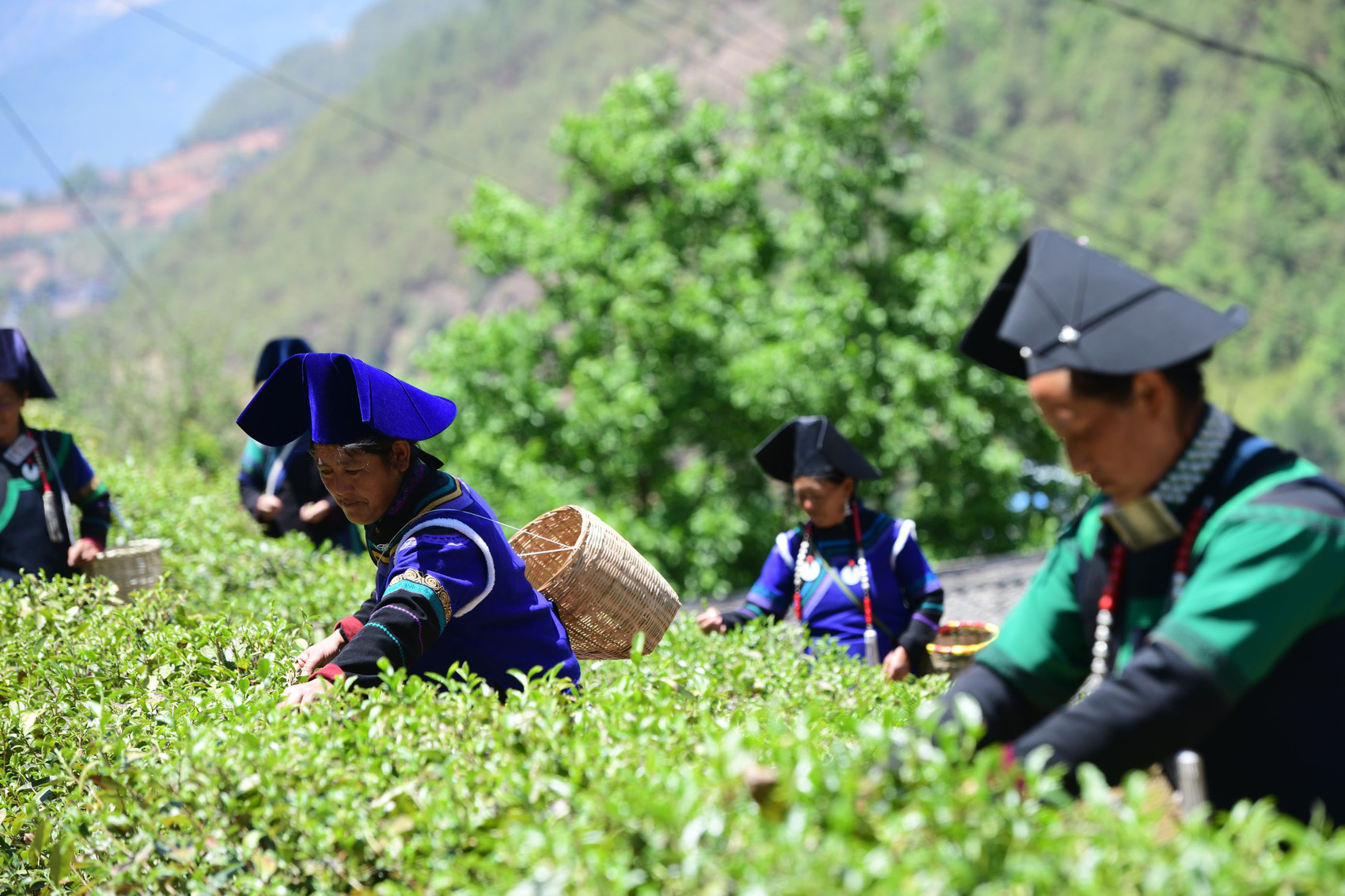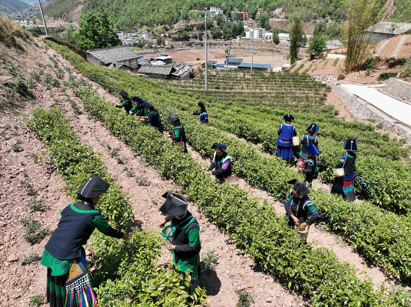 “孙水河中水,灵关古道茶。”成片种植地茶树,在阳光的照耀下发出油亮的光泽,一群彝族妇女背着竹制的采茶篓,穿行在茶林间,采摘茶叶。这是4月27日,川观新闻记者在四川凉山彝族自治州喜德县且拖乡且拖村看到的情景。