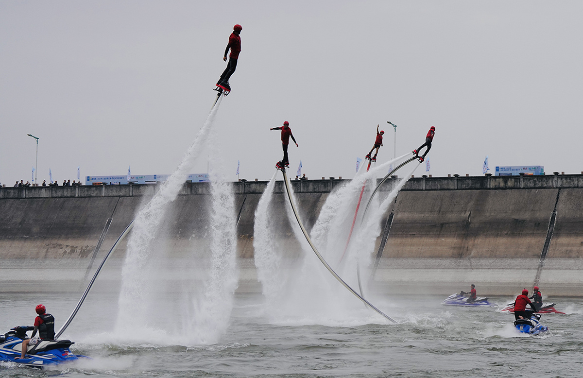 4月28日,随着一条“水龙”从三台县鲁班湖喷涌而出,湖面上,特技演员时而一头扎进湖面,时而一跃冲上10多米的空中,一连串的凌空翻滚引得岸上蜂拥而至的观众不断惊呼叫好……当天,2023年三台县第五届鲁班湖文化旅游节在鲁班湖主坝开幕。