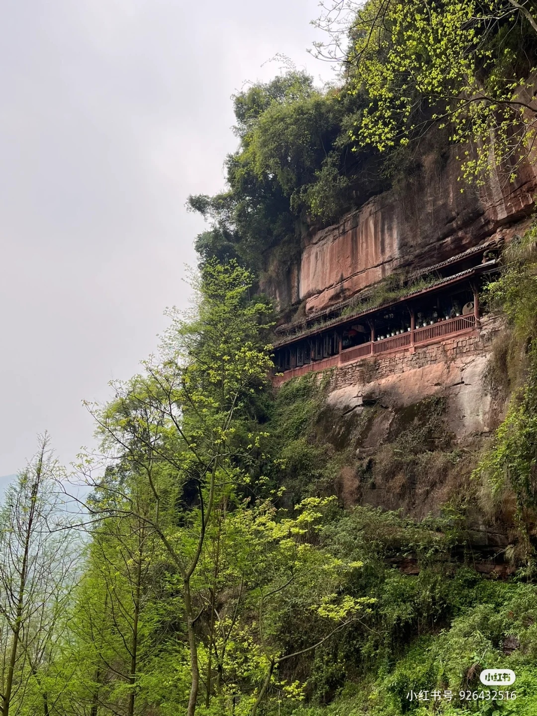 造像开凿在半山腰上的峭壁之上,密密麻麻的摩崖雕像,占据了整个山壁。更令人叫绝的是,雕刻这些石像的工匠们,竟在峭壁上开出了一条长一百五十多米的回廊,回廊上还建有房屋、亭台、门洞。
