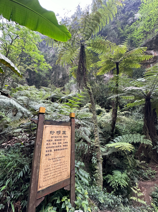 桫椤与恐龙同代,距今已有2亿年的历史,是国家一级保护植物,被称为"植物界的熊猫"。
