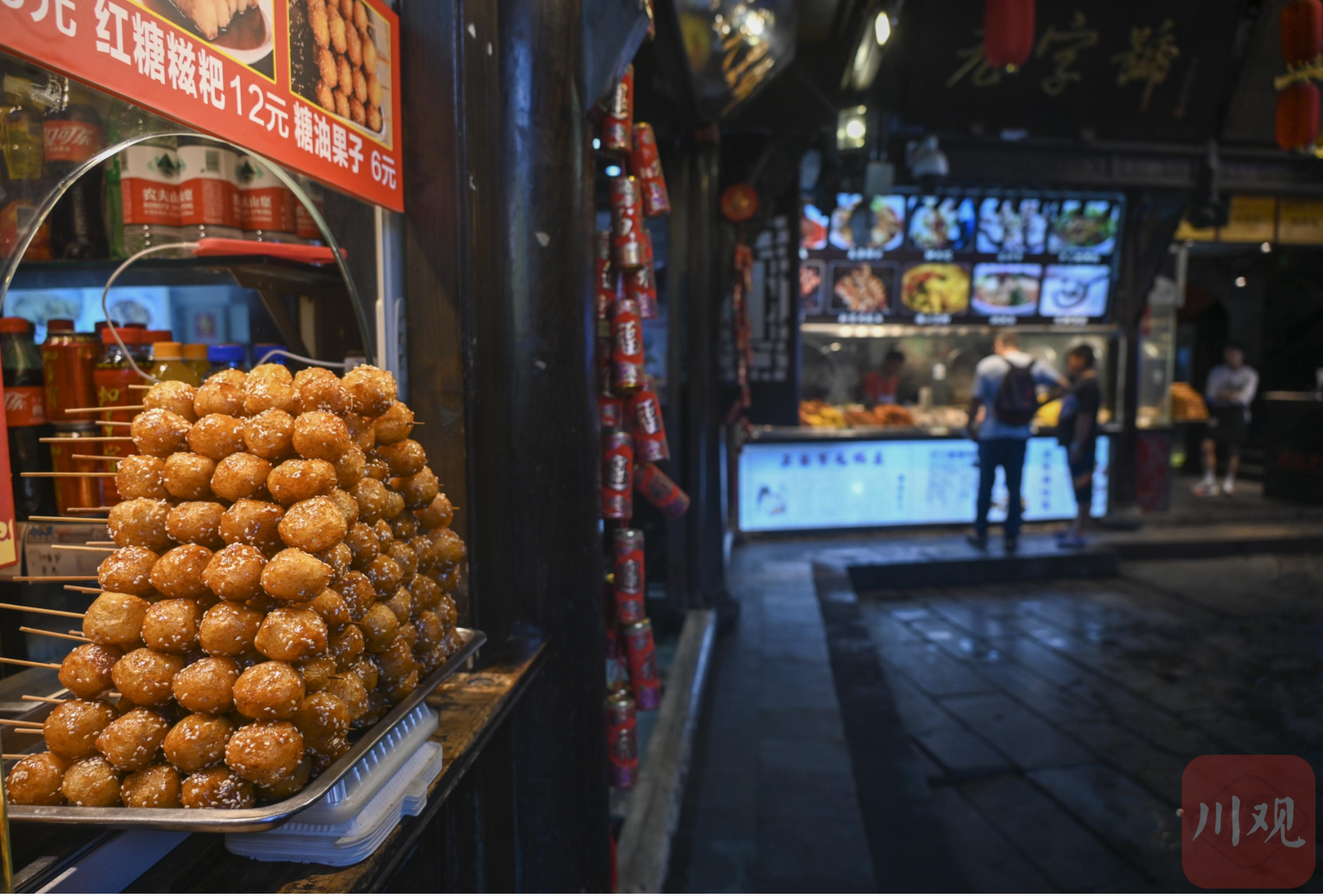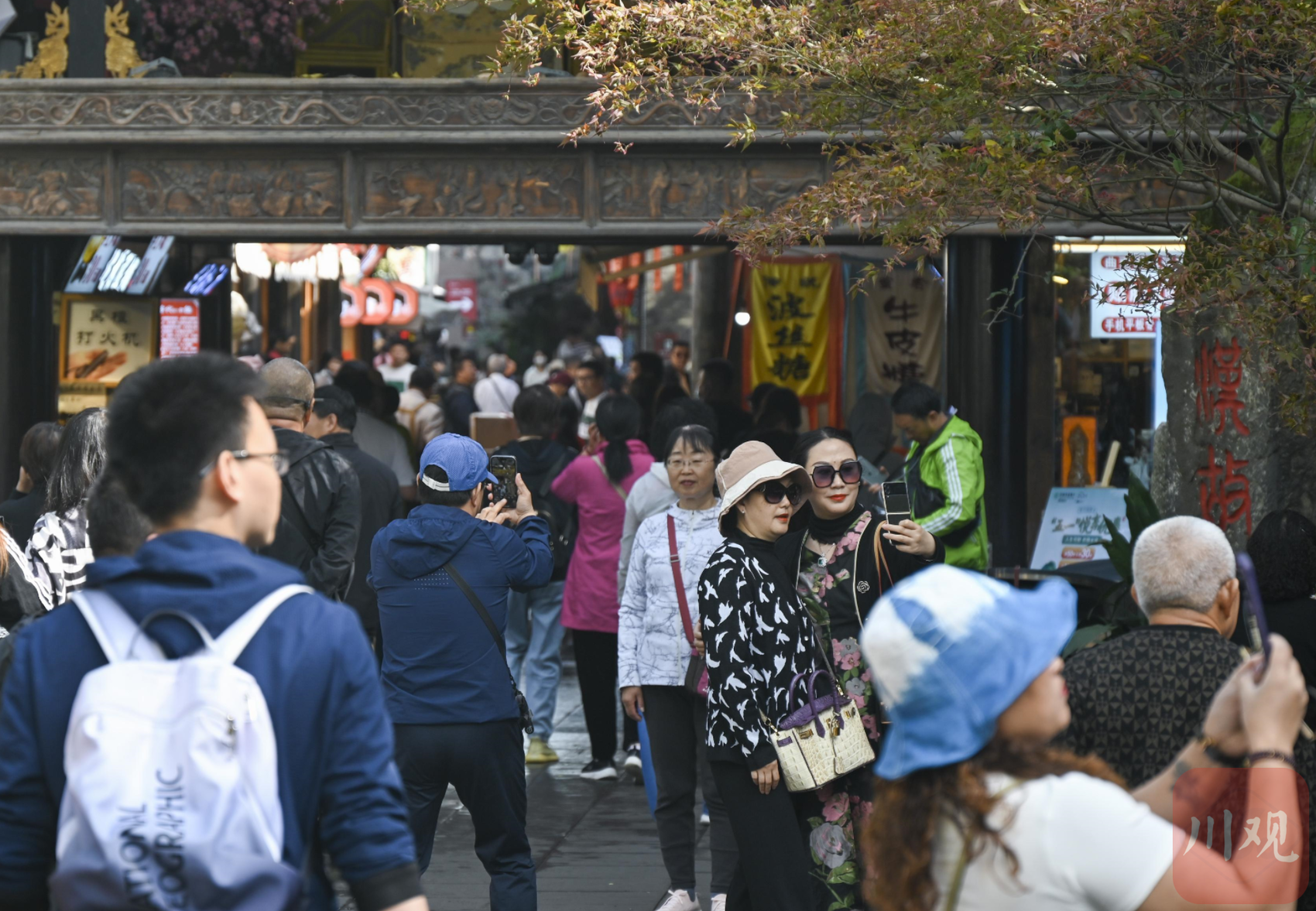 成都市锦里景区里,游客们看川剧、品小吃、体验三国文化,享受安逸生活,度过愉快假期