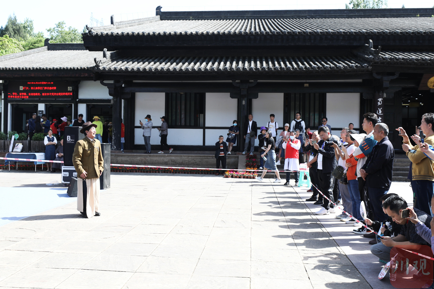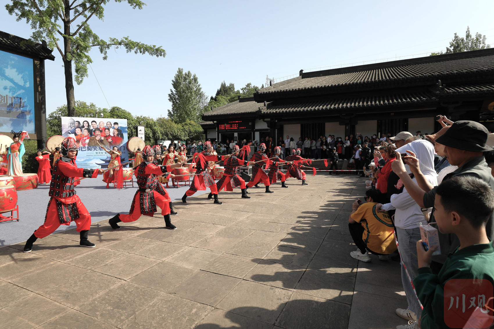 “音效很震撼,这个《战鼓舞》仿佛把我带去那个战马奔腾、马蹄声碎的年代,代入感很强。”上午9点半,在景区北门游客中心,一场以“古风群英荟蜀道”为主题的文艺演出吸引了大波游客驻足观看。