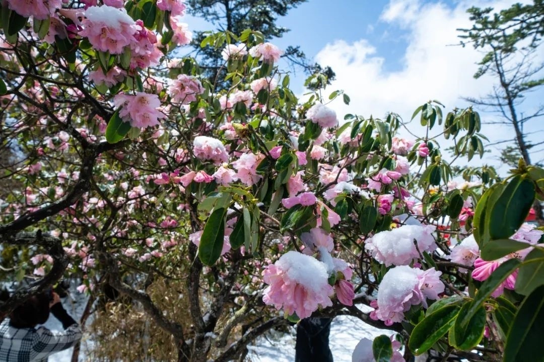 此时,正值峨眉山高山杜鹃花盛开的季节,娇艳的花朵被冰雪覆盖,仿佛穿上了一件晶莹剔透的“冰衣”,春与冬的碰撞,花与雪的交融,形成了峨眉山冰雪杜鹃的奇异美景。游客们被这难得一见的暮春雪景所吸引,纷纷驻足拍照,感受冰雪杜鹃美景的独特魅力。