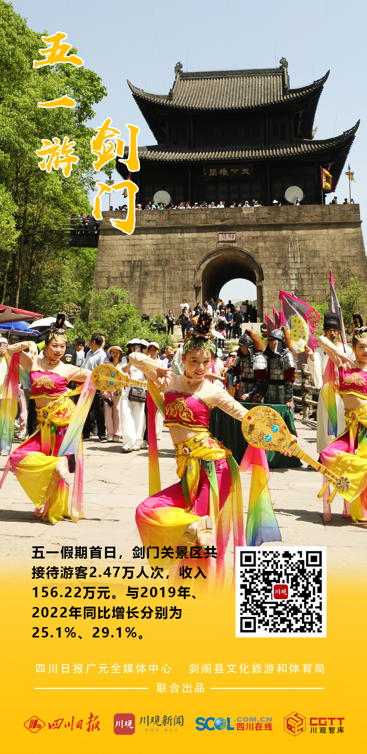据介绍,4月29日,五一假期首日,剑门关景区共接待游客2.47万人次,收入156.22万元。与2019年、2022年同比增长分别为25.1%、29.1%。