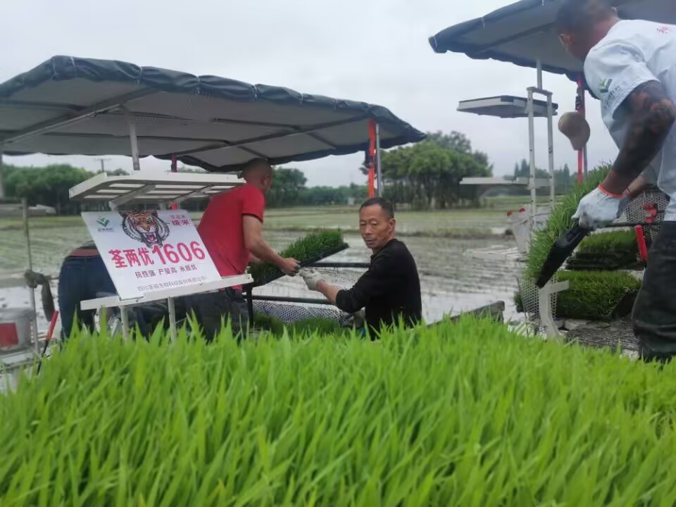 记者目光所及的两三亩地里,三台插秧机和六七个人正在细雨里忙碌着。成都市稻种农业服务公司负责人王道忠也赶到现场,“今天是我们第一批秧苗下田,今年总共育秧面积达到1800亩,为周边崇州、新津、都江堰的种植大户提供秧苗和插秧机,从今天开始可能要忙到5月中旬。前两年都选择用荃银公司的这两个品种,产量高,而且抗倒伏,种植大户非常喜欢,所以今年我们还是用荃银公司的品种,2000多亩的秧苗就等着下地了。”