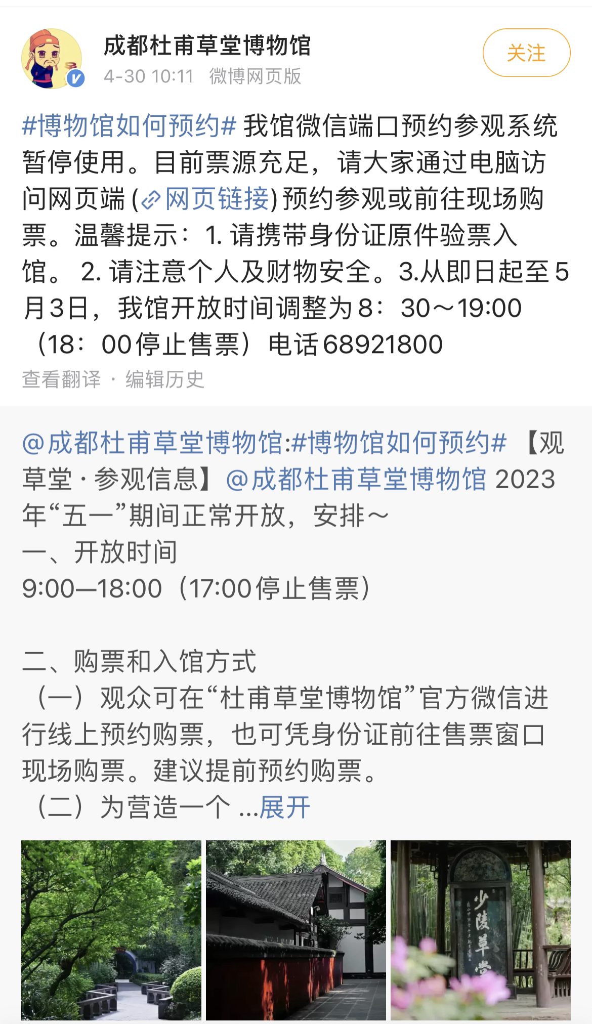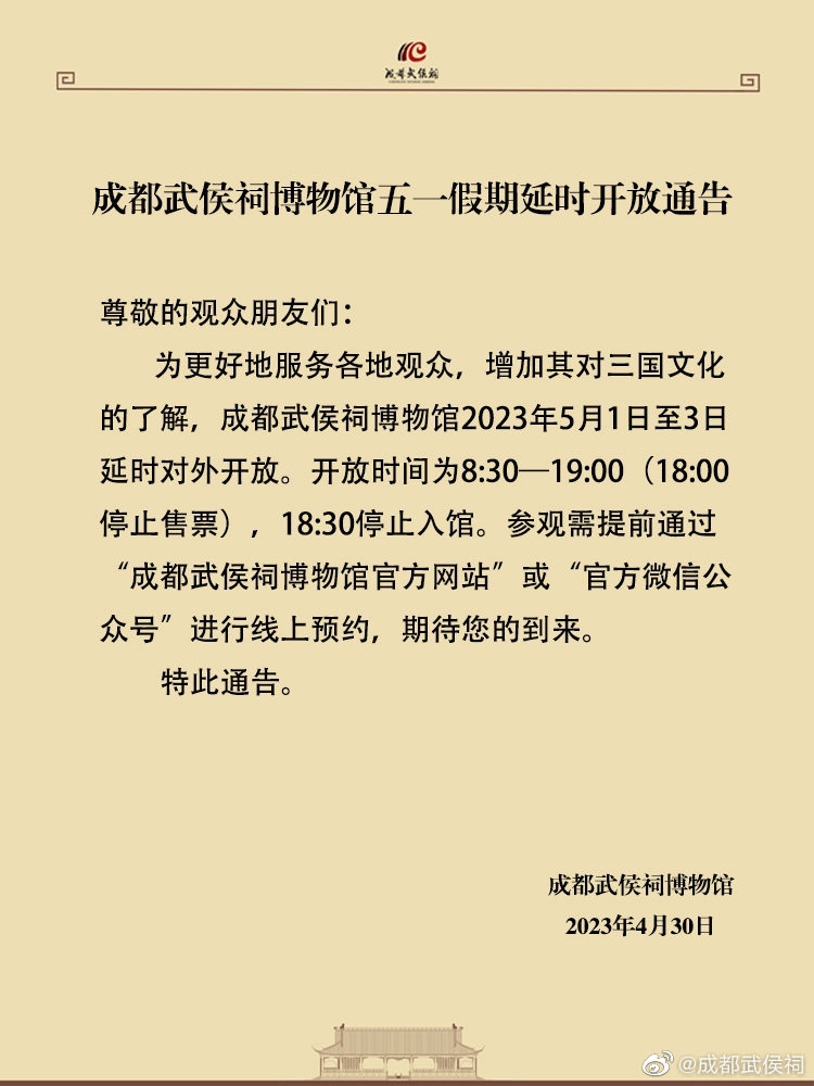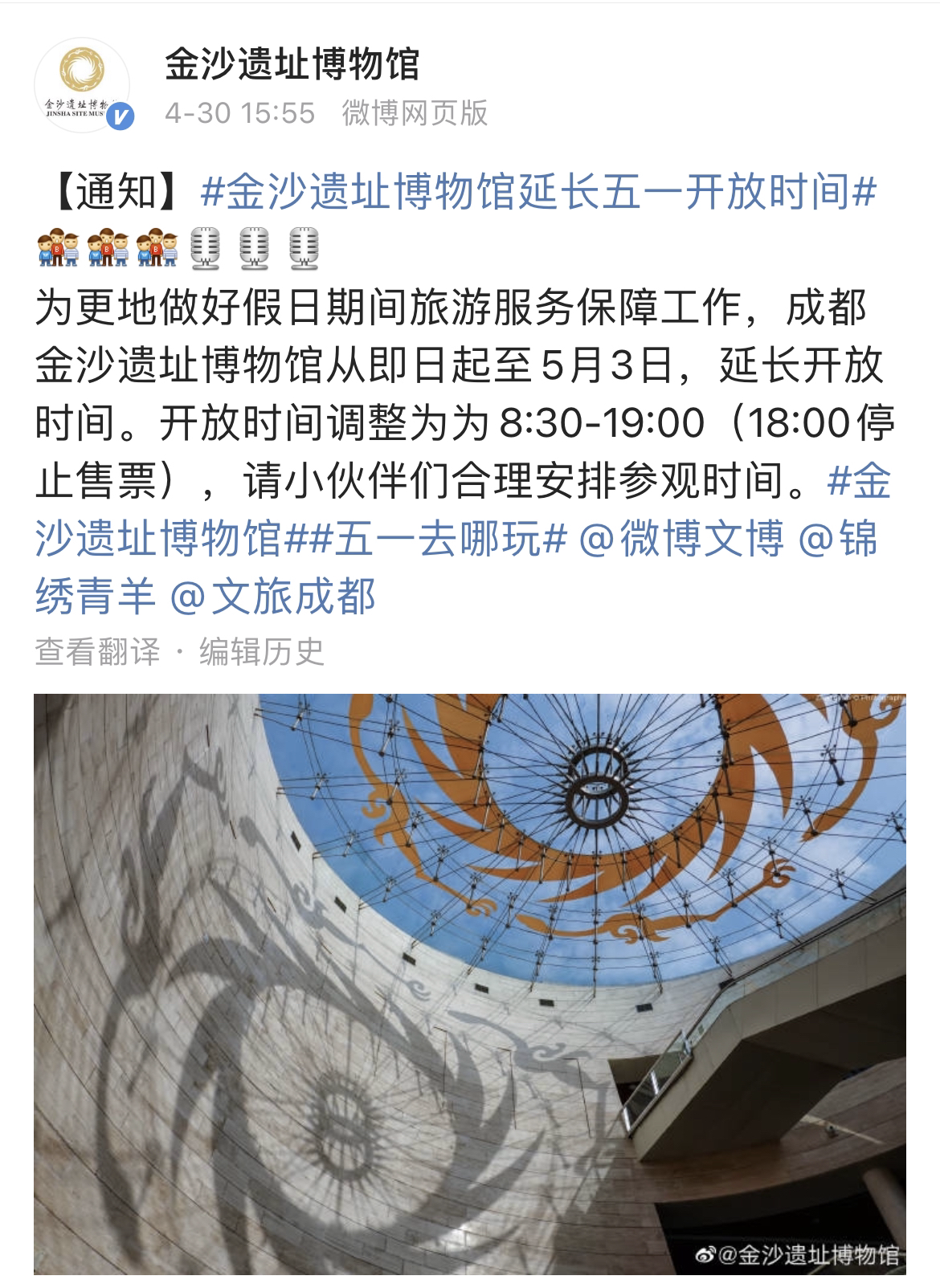 4月30日下午,金沙遗址博物馆、杜甫草堂博物馆和武侯祠博物馆相继发布延长开放时间的通知。