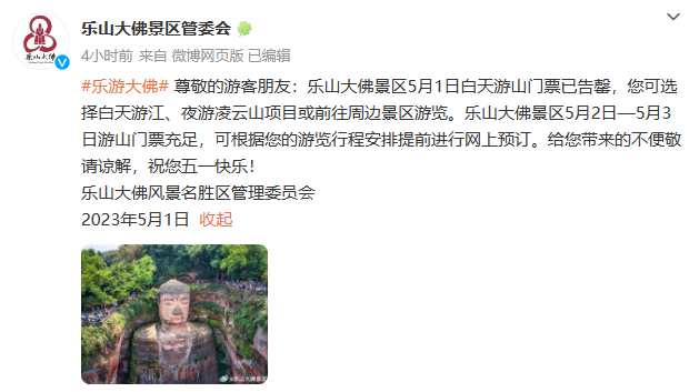 5月1日上午,乐山大佛景区管委会官方微博发布消息,乐山大佛景区5月1日白天游山门票已售罄。游客可选择白天游江、夜游凌云山等项目。