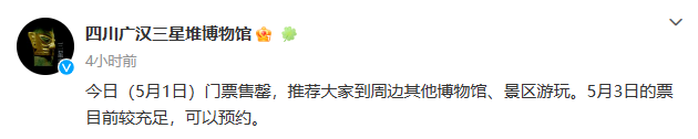 5月1日上午,广汉三星堆博物馆微博消息显示,今日门票已售罄,5月3日门票可以预约。