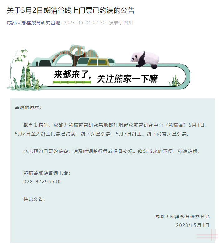 5月1日成都大熊猫繁育研究基地发布公告,熊猫谷5月1日、5月2日全天线上门票已约满,线下少量余票,5月3日线上、线下尚有少量余票。
