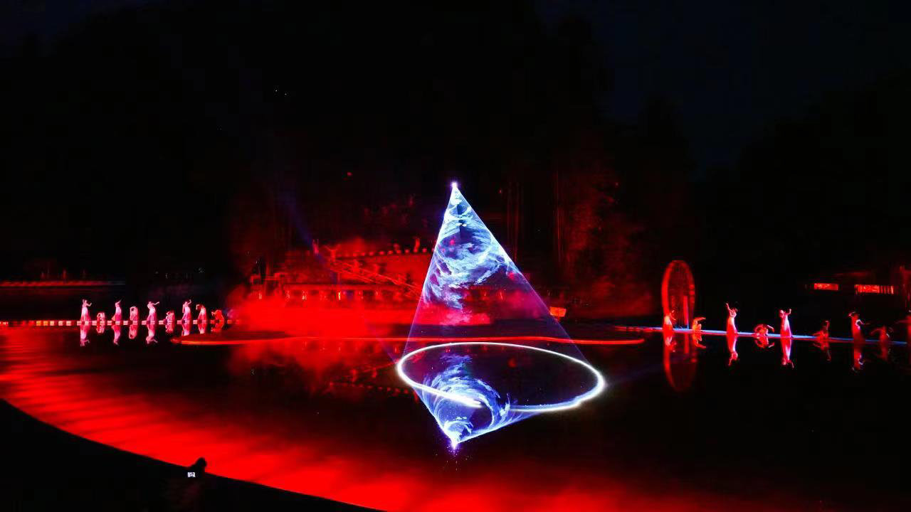 整场演出摘取威远发展史上的高光片段和代表性文化元素,与灯光视效等互动手段相互结合,在山水间施展泼墨重彩,与舞美、投影虚实结合,组成了一幅美丽的全景式山水画卷,营造出强烈的视觉效果和艺术冲击力,观众在穹窿山水间享受视听盛宴。
