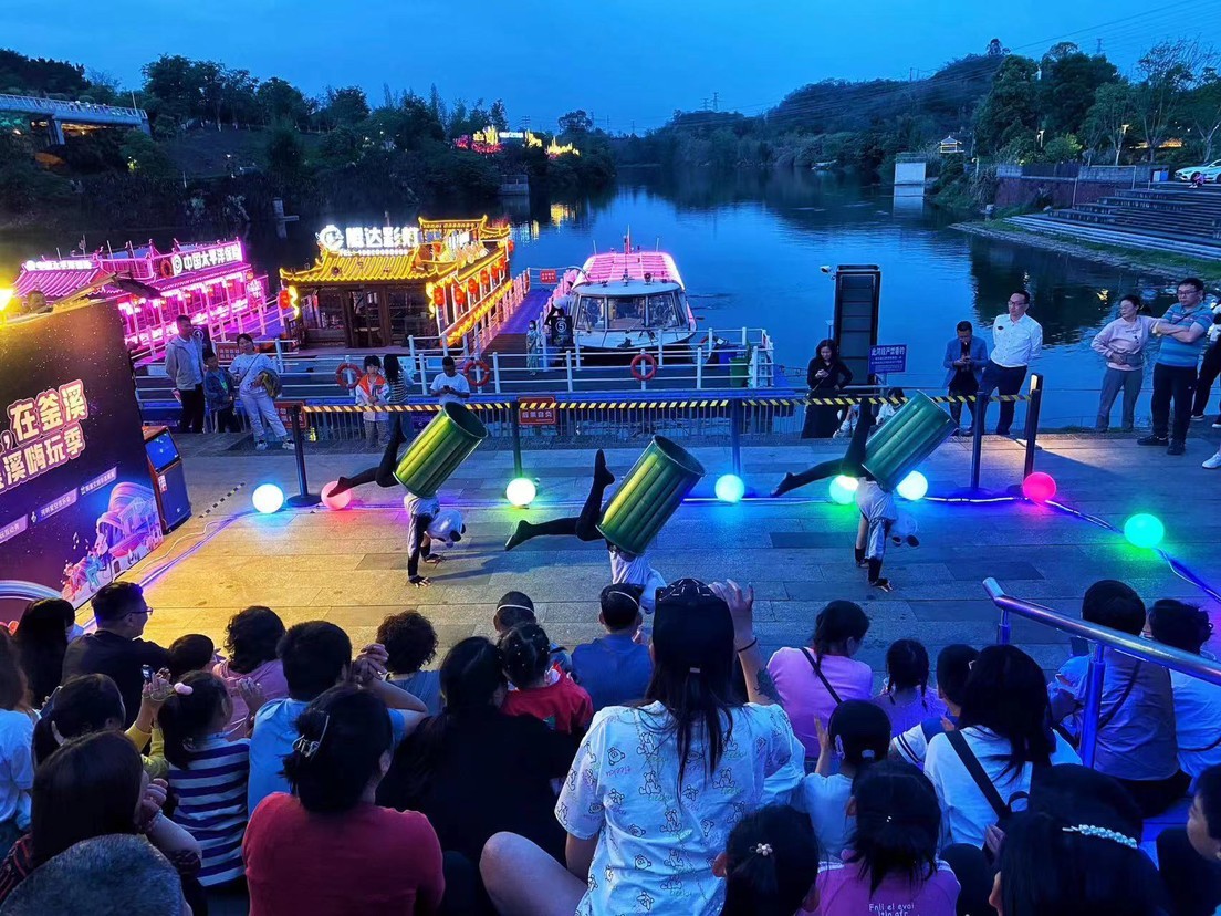 4月30日晚,在釜溪河畔,一场“自贡夜·在釜溪,五一釜溪嗨玩季”的活动正在火热进行,自贡市杂技团培训部今年新推出的节目——“熊猫钻桶”,形式新颖,内容丰富,高难度的技艺让现场观众直呼过瘾,连连拍手叫好。
