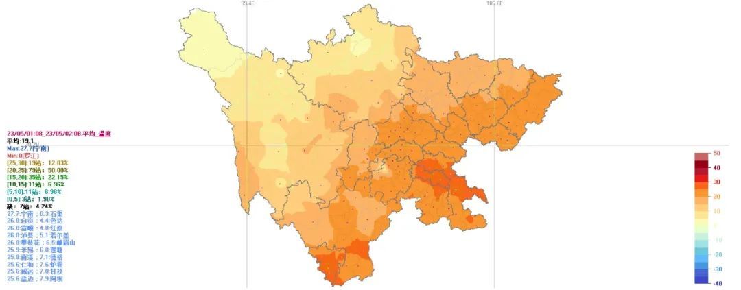 昨天08时到今天08时,盆地最低气温北部11~14℃,其余地方15~19℃;最高气温北部22~25℃,其余地方27~30℃。