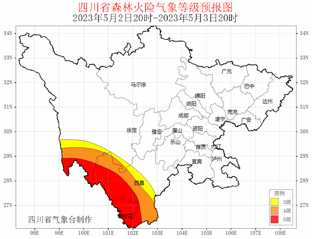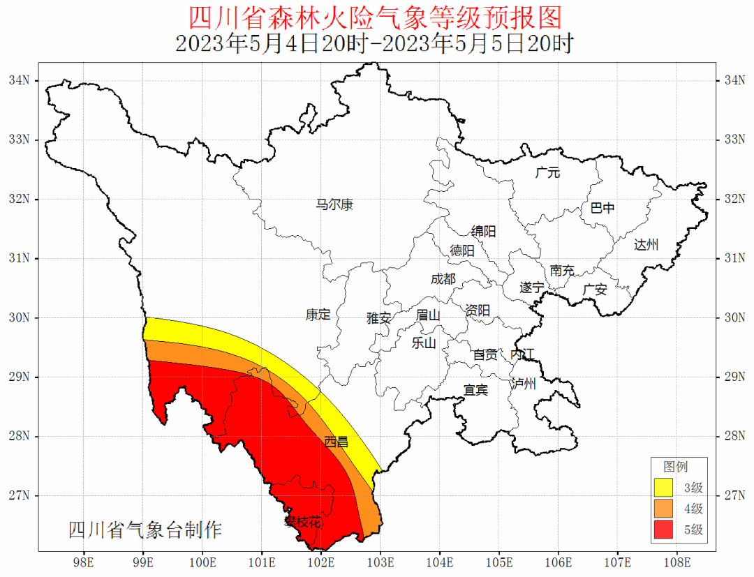 据最新气象资料分析:5月2日20时~5日20时,甘孜州南部和攀西地区西部南部以晴间多云天气为主,气温较高,空气干燥,森林草原火险气象等级大部为4~5级。请相关州市加强火源管理,做好森林防火工作。