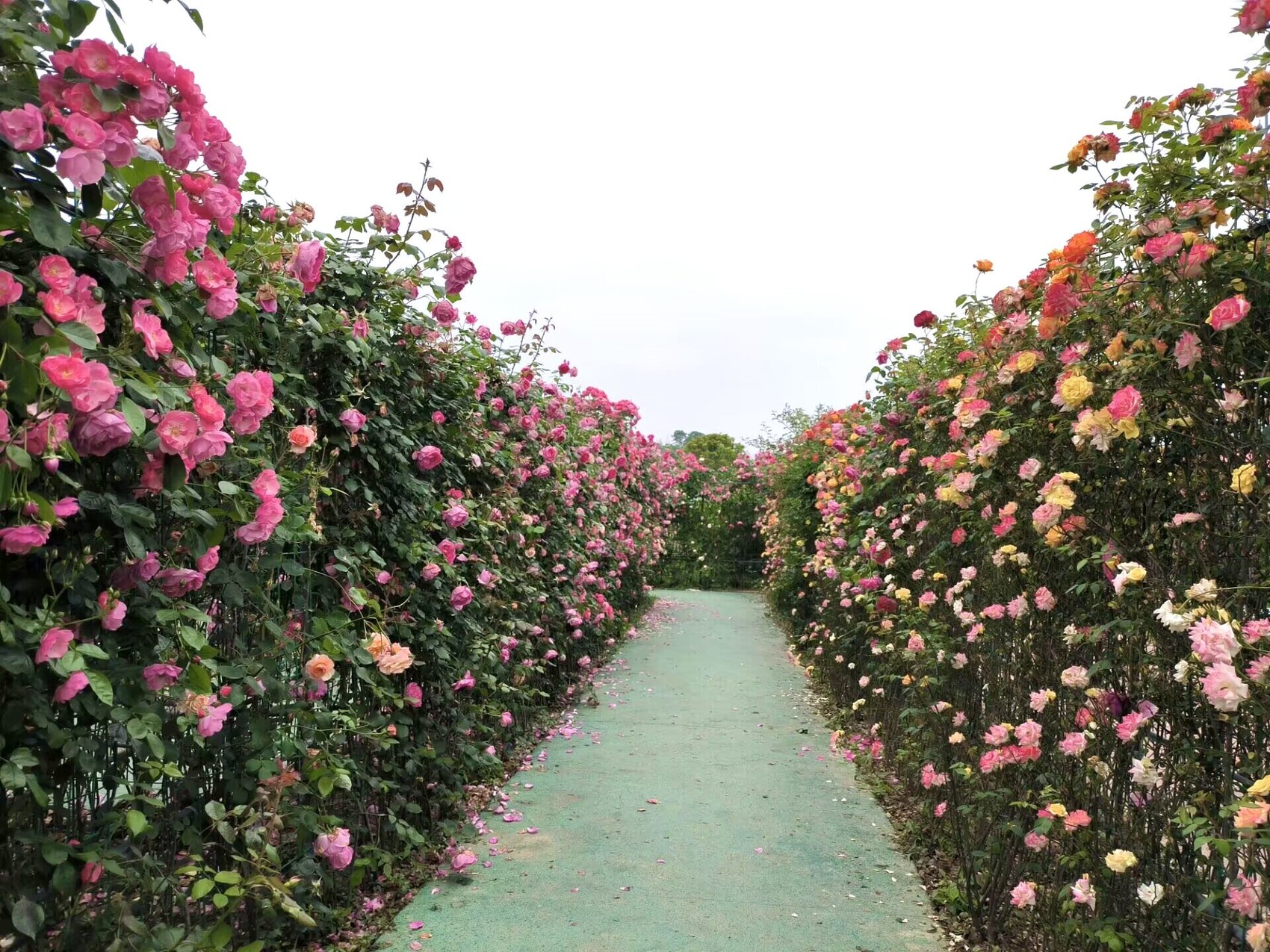 即便不是节假日,在玫瑰花墙也会出现交通堵塞。“这个玫瑰花墙长约2公里,近2米高,如果慢慢游玩,一般要花费近40分钟时间。”陈勇介绍,玫瑰花墙有10多个品种,以小花为主。穿梭在花墙中,悠悠玫瑰花香,让人心旷神怡。