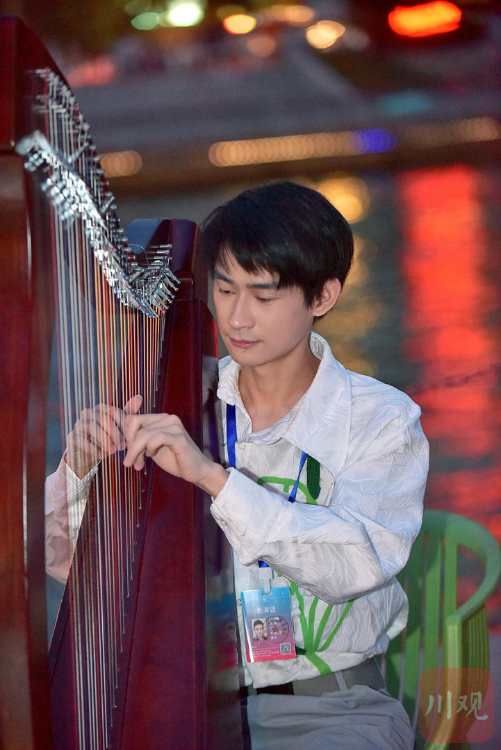 这场河边的“音乐会”是鲜活的、肆意的,是治愈的、安静的。人们沉浸其中,时光好像也慢了下来。“电影主题曲《我心永恒》响起时,河面上恰巧经过一艘游船,很是应景。”在这个“五一”的春夜,彭悦在这里见证了成都的“人间美好。”
