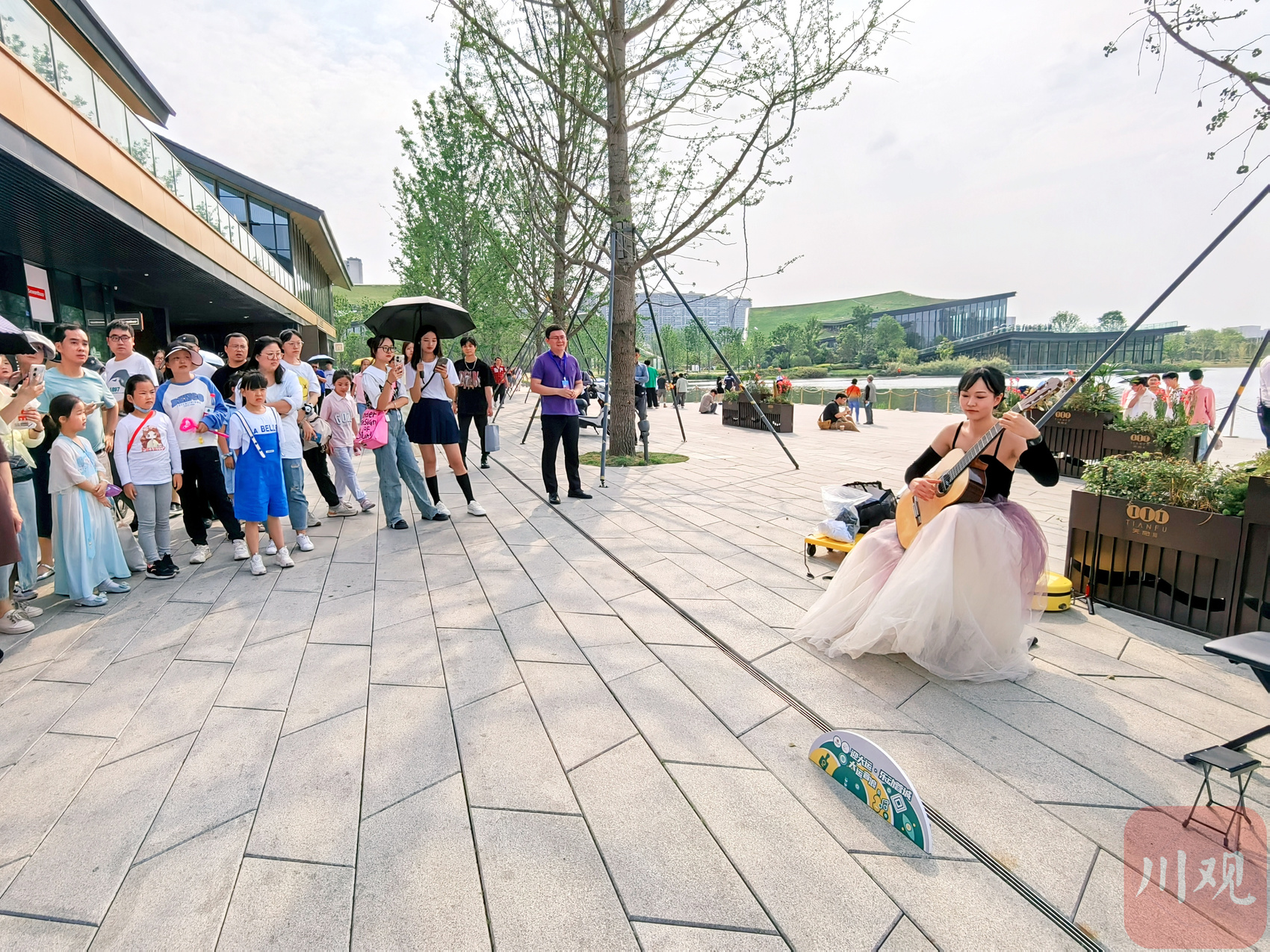 这样的热闹,可以在5月2日寻得。当天,街头艺人陈世扬将箜篌演奏搬入天府艺术公园,和搭档开启一场二重奏。钢琴和箜篌音色巧妙相融,让游客熊文颇感新奇,“第一次在街头听箜篌,一秒沦陷。”