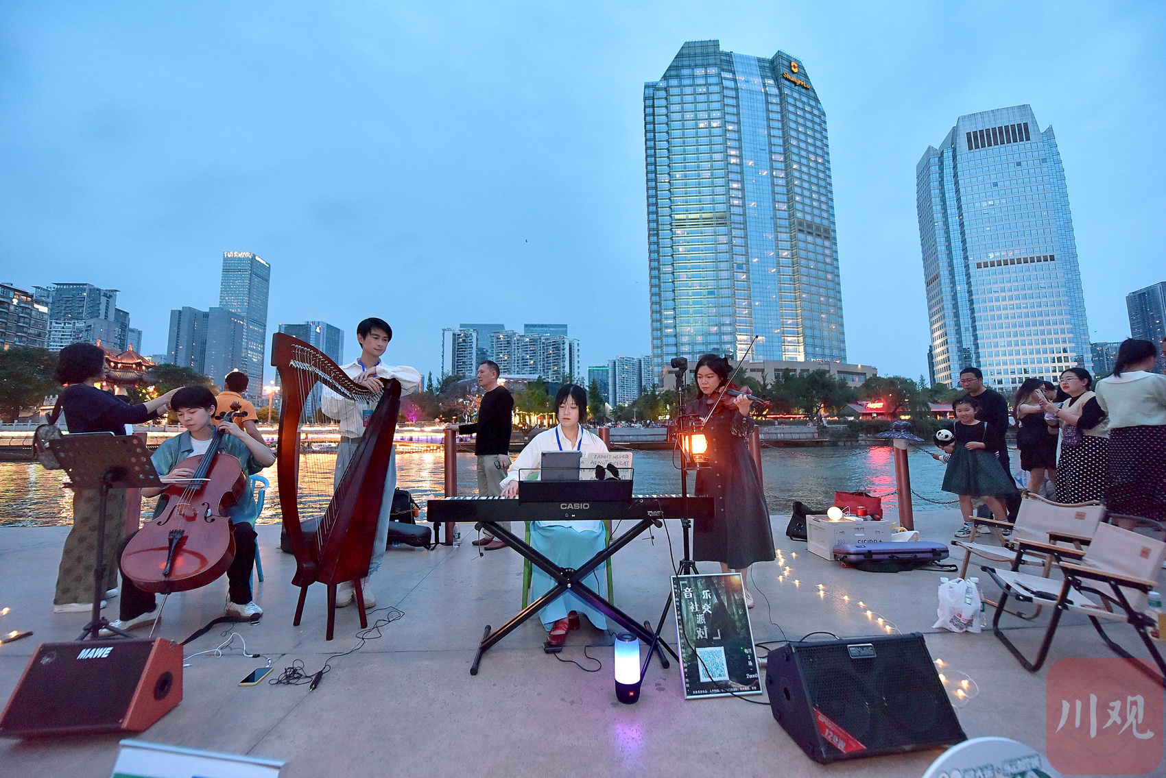 人潮涌动的街头,拉满了节日氛围。街头演出,像是一场音乐的约定,带人们行走街头,用音乐治愈人心。如果说,三色路的演出是人间烟火,5月1日晚,在成都合江亭上演的钢琴、小提琴、竖琴、大提琴四重奏,则拉满了五月春色的氛围感。黄昏落于夜幕,万家灯火渐起,府河河畔,不期而遇的四重奏,让游客彭悦邂逅了一场“小确幸”。