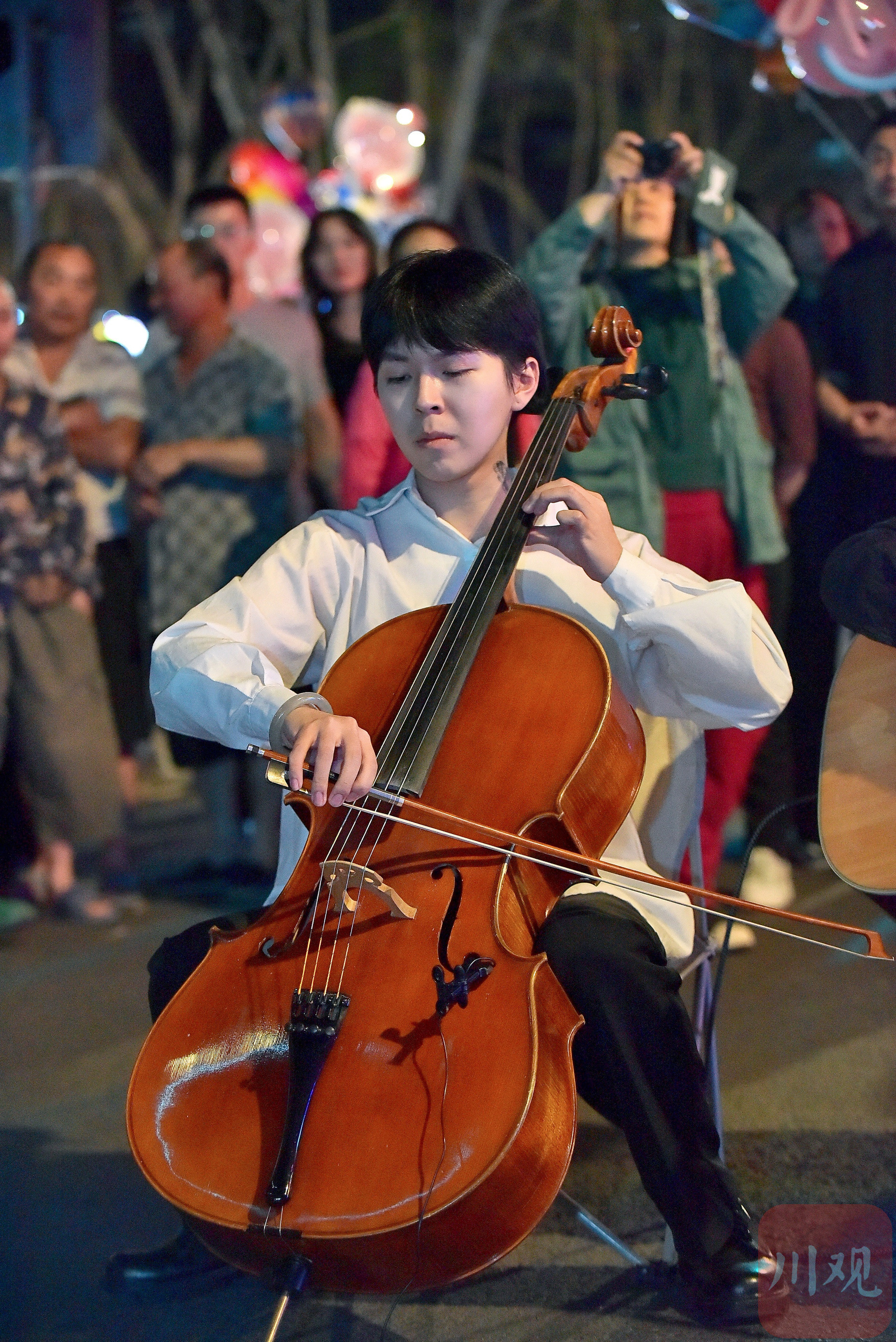 4月30日晚,成都三色路夜市,一场大提琴演奏奇妙夜在这里上演。三色路夜市以“后备厢+露营风+霓虹灯”特色走红,是年轻人口中的“西双版纳分纳”打卡地。“嗞嗞”作响的铁板烧,配着舒缓的琴声,高雅的大提琴仿若一秒跃入人间烟火的日常。“这种混搭很成都。”围观游客陈玥然说。