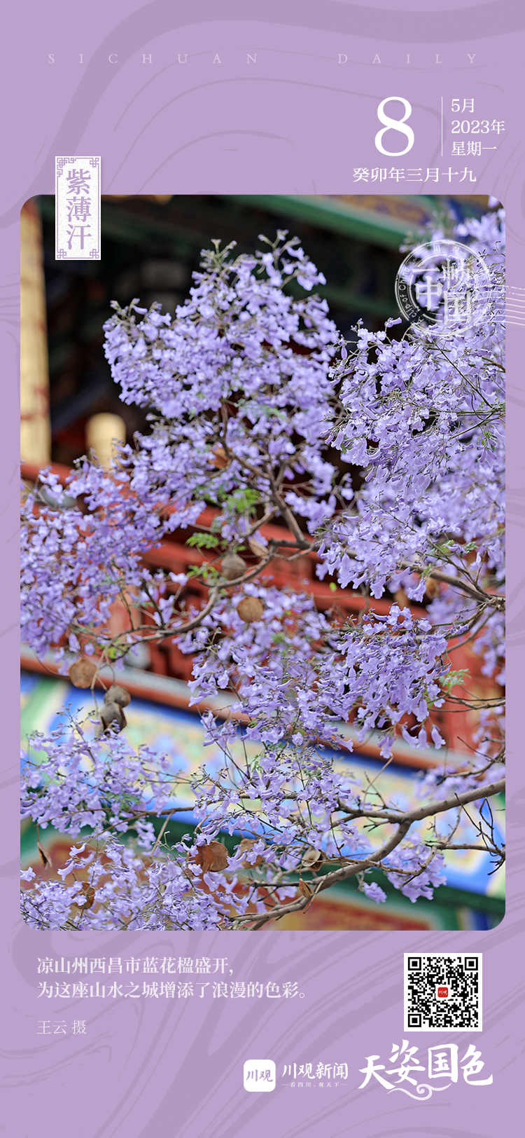 汗血宝马的故事虽有传说的色彩,但初夏时节盛开的蓝花楹却近在眼前。从西昌全市到成都街头,当蓝花楹盛开,如一片紫雾,朦胧清雅,似梦非梦,恰是紫薄汗色。若再伴着艳阳,一树蓬勃绚烂的花朵,团团簇簇仿佛万马奔腾,更是浪漫唯美赏心悦目。