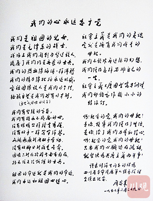 周恩来总理亲笔抄录《我们的心永远忠于党》 。四川省地方志工作办公室 成都市新都区地方志编纂委员会办公室提供