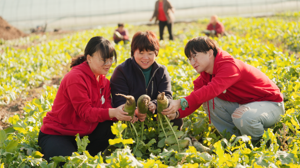 张晓恬(左)、张岩林(右)与西槐庄村委会工作人员(中)一起收获萝卜