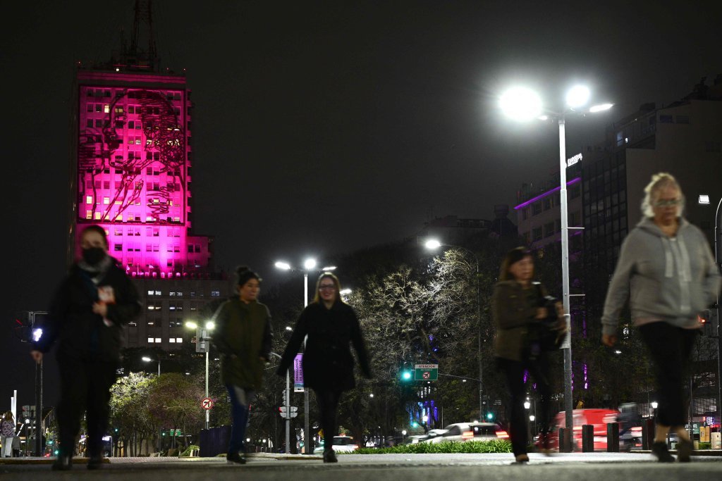 2022年10月19日,人们从位于布宜诺斯艾利斯的阿根廷社会发展部大楼前走过。大楼表面挂出阿根廷前第一夫人埃娃·庇隆的巨型肖像,并被粉色灯光照亮,以呼吁关注乳腺癌防治。每年10月是世界乳腺癌防治月。图据新华社/法新