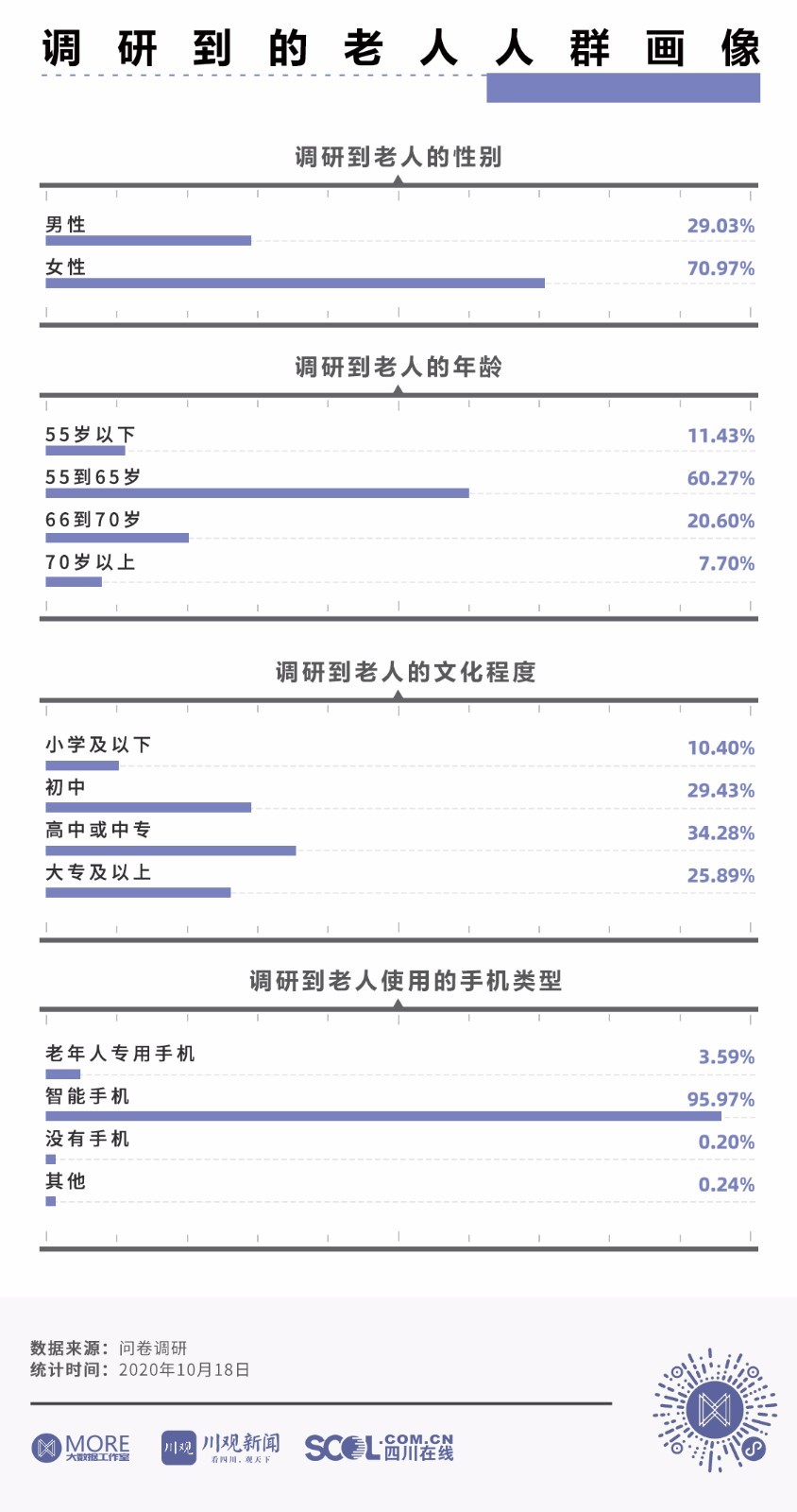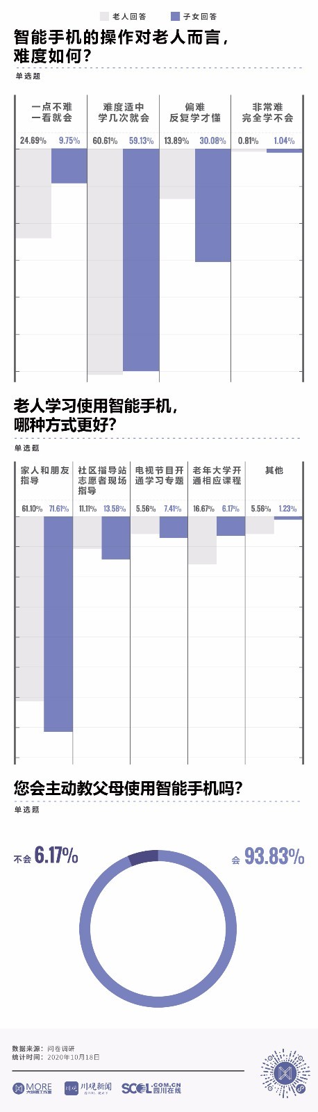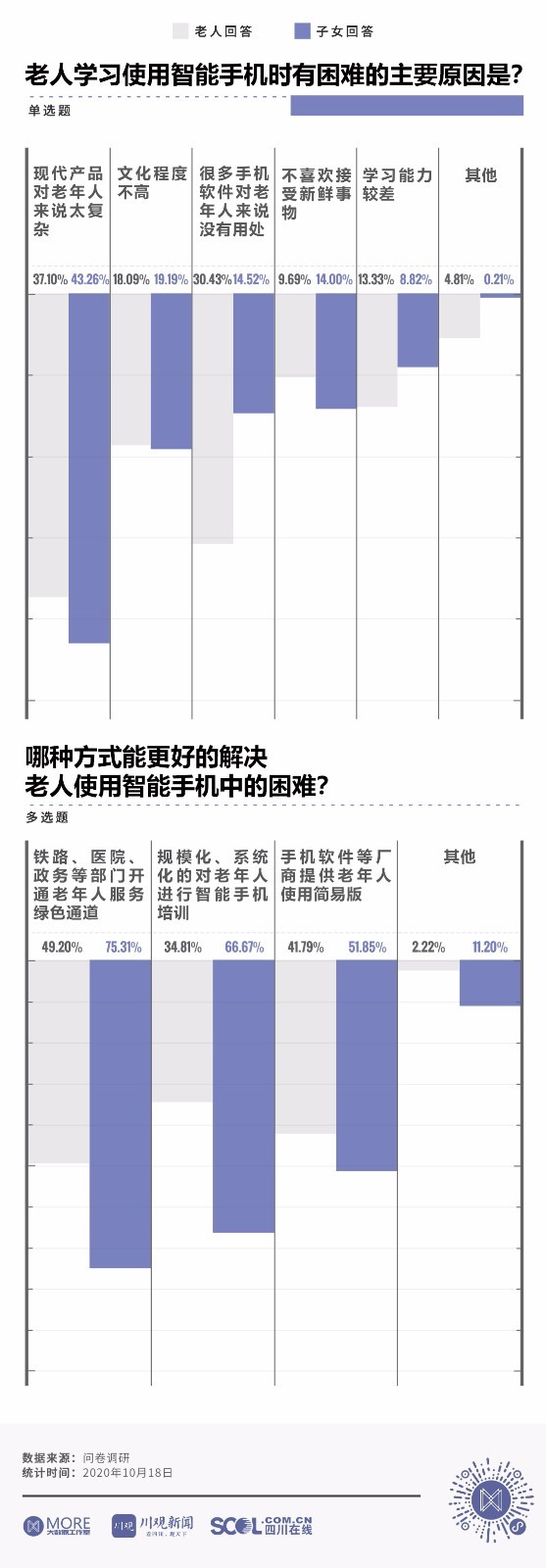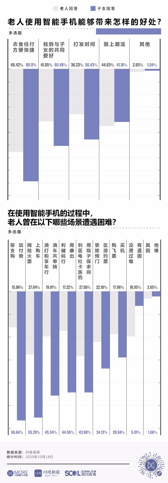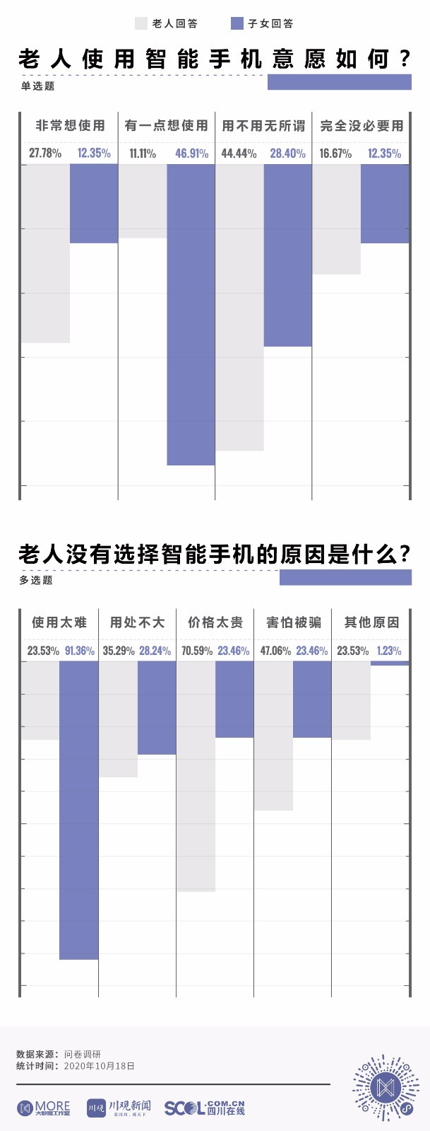 数字化生活将购物、挂号、购票、点餐等线下活动搬到了线上,便利了大众的同时也让不少老人难以适应智能时代带来的变化。互联网浪潮之下,老人的数字生活是怎样的?川报全媒体川观新闻、 MORE大数据工作室和康养四川事业部从老人和子女的视角出发,以中老年群体智能手机使用情况为切口,通过问卷调查,看中老年群体在智能社会中的生活状态。