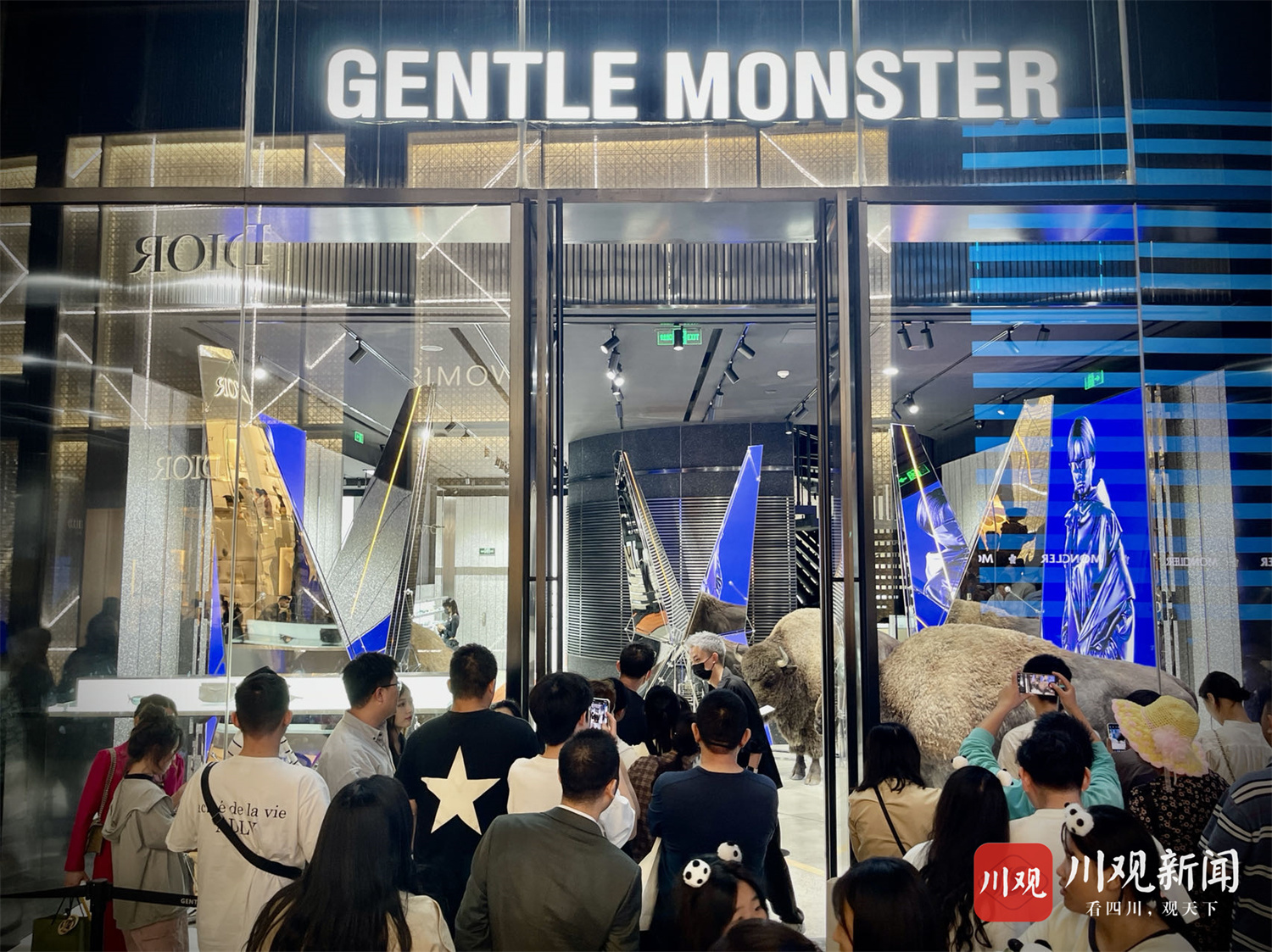 “成都太时尚了!”从北京来成都旅游的厉璟告诉记者,多头“牦牛”机械装置“闯入”商业街区,让一家销售太阳镜的街边店变得十分火爆,这让人有些意想不到。5月1日晚间,记者跟随庞大的人流在春熙路商圈走访时看到,位于成都远洋太古里的GENTLE MONSTER全新旗舰店打造了兼具前瞻性、实验性和艺术性的眼镜零售空间。同时,“撇捺之间”成都城市生活艺术体验展在漫广场展出,吸引了众多人驻足观望和排队探店。