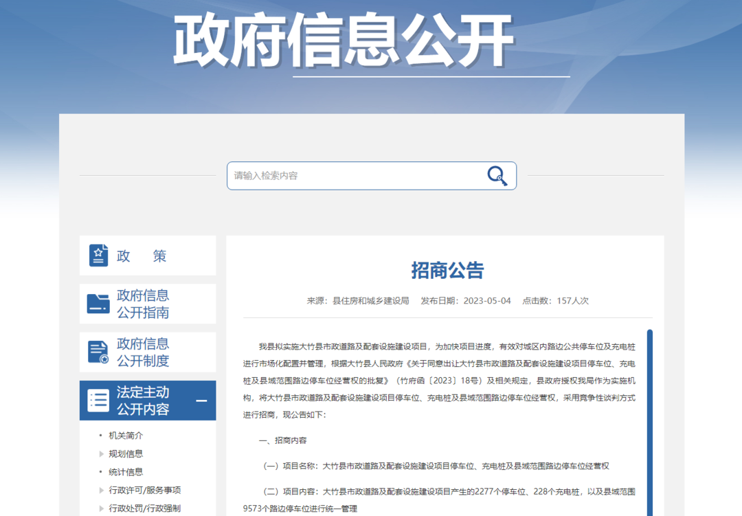 日前,四川省大竹县人民政府官网发布一则“招商公告”,对该县市政道路及配套设施建设项目产生的2277个停车位、228个充电桩,以及县域范围9573个路边停车位经营权进行公开出让,限定“合作期限”为25年,采用竞争性谈判方式进行招商。