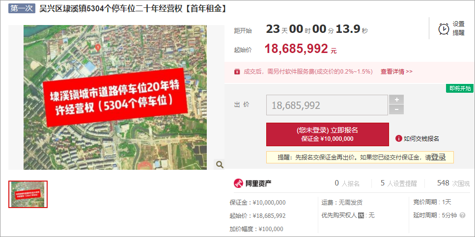 早在2022年7月,浙江省湖州市就通过阿里拍卖网,挂出湖州市吴兴区埭溪镇两批停车位二十年经营权标的,分别是《吴兴区埭溪镇5304个停车位二十年经营权》和《吴兴区埭溪镇3914个停车位二十年经营权》的拍卖公告。起拍价分别为1868.5992万元(20年总起拍价37371.984万元)和1336.1839万元(20年总起拍价26723.678万元),合计20年总起拍价64095.662万元。