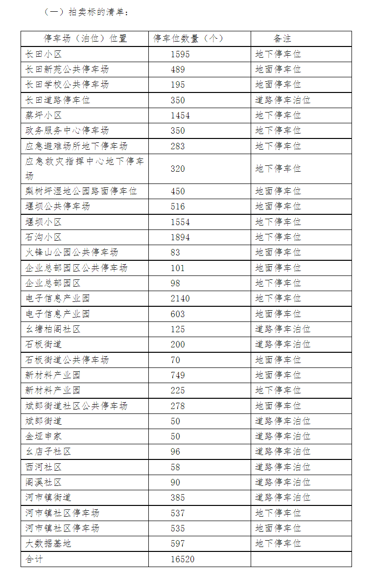 达州高新区拍卖的16520个停车位经营权列表