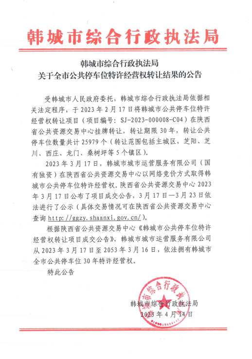 陕西省韩城市公共停车位转让结果公告