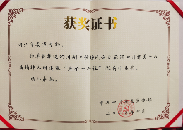 内江市报送的川剧《糖坊风云》获得四川省第十六届精神文明建设“五个一工程”优秀作品奖。