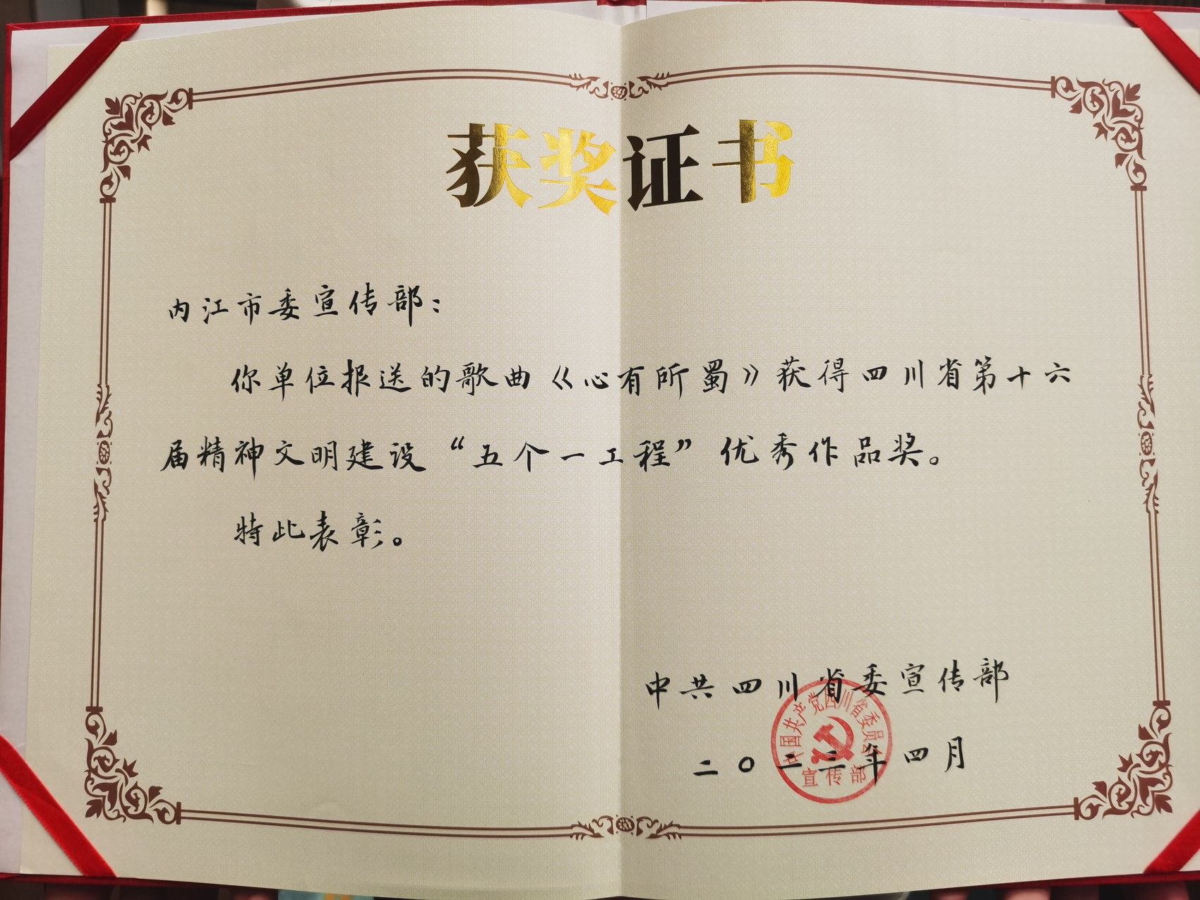 内江市报送的歌曲《心有所蜀》获得四川省第十六届精神文明建设“五个一工程”优秀作品奖。