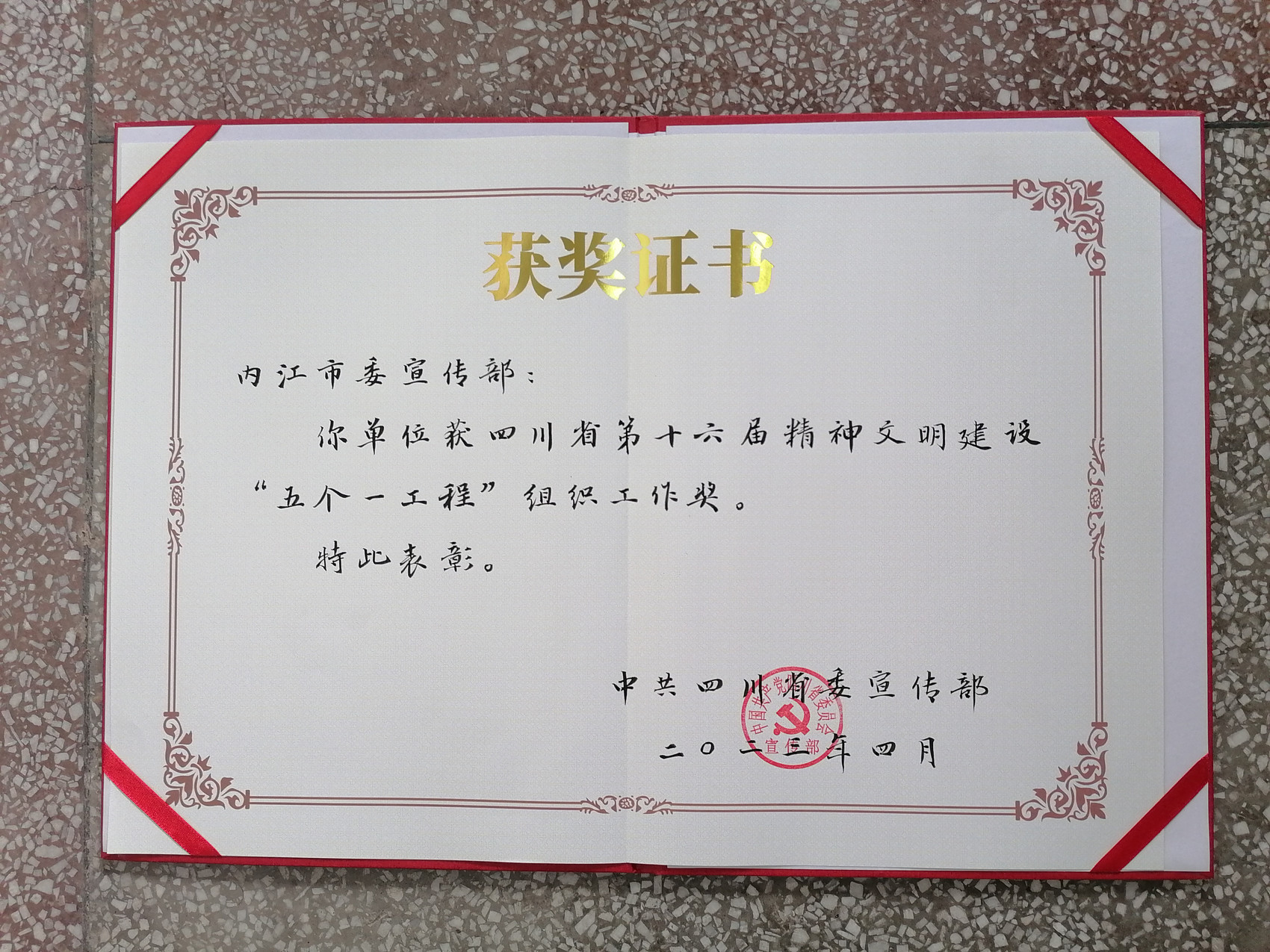 内江市委宣传部荣获四川省精神文明建设“五个一工程”组织工作奖。