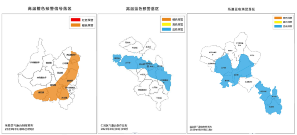 此次高温预警集中在攀枝花市。气象部门预计:从今日开始,未来3—5天,盐边县惠民镇、新九镇、永兴镇、渔门镇、红格镇、桐子林镇,仁和区金沙江流域沿线乡镇(福田镇、太平乡、前进镇、仁和镇、大河中路街道、大龙潭彝族乡)将出现38℃以上的高温天气;米易县草场镇、白马镇、撒莲镇、得石镇、丙谷镇、攀莲镇、新山傈僳族乡、湾丘彝族乡等乡镇今日最高气温将升至38℃以上。请以上地区的单位和居民注意做好防暑降温工作,午后高温时段应尽量避免户外活动,注意用电用火安全。
