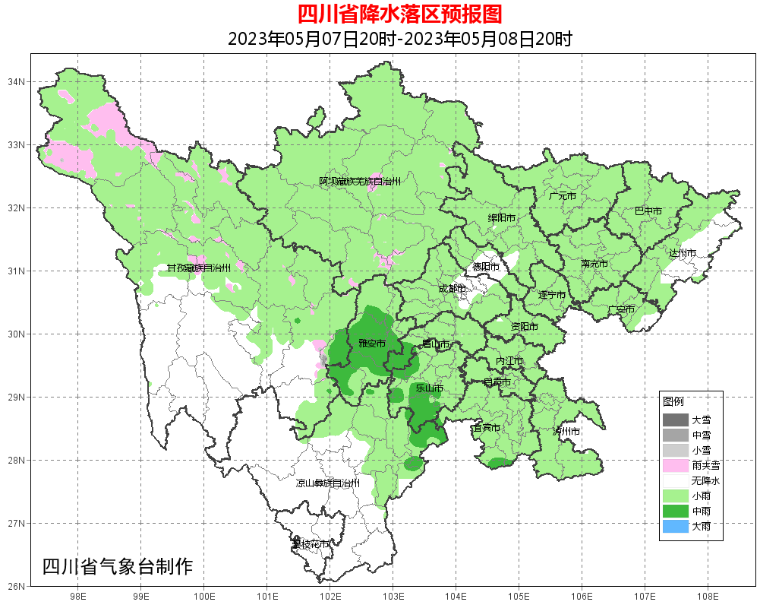 7日晚上到8日白天,盆地大部阴天有阵雨,其中雅安、乐山、眉山3市局部有中雨;甘孜州东部北部、阿坝州及凉山州东北部阴天间多云有阵雨(雪)或雷雨。
