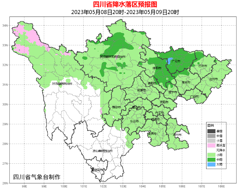 8日晚上到9日白天,盆地大部阴天有阵雨,其中广元、绵阳2市有中雨,个别大雨;甘孜州北部、阿坝州阴天间多云有阵雨(雪)或雷雨,局部中雨。