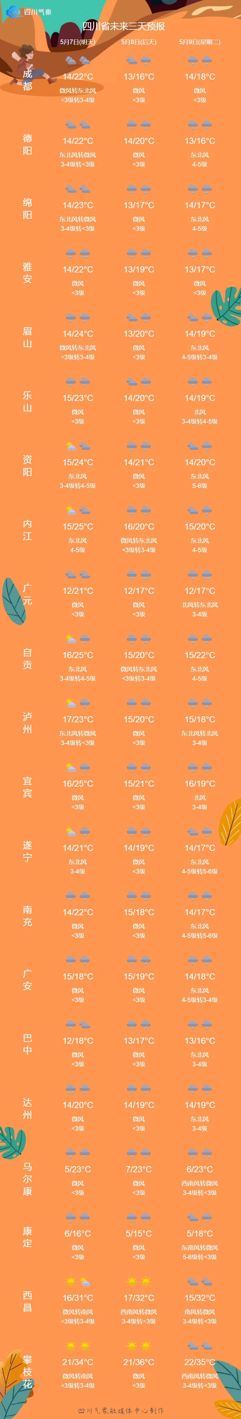 四川省气象台今天下午发布的最新天气预报显示:未来三天,盆地大部以阴天为主,多阵雨或雷雨;川西高原东部北部多云间阴天有分散阵雨(雪)。甘孜州西南部和攀西地区大部降水偏少,草原、森林气象火险等级高。未来三天,很多城市的最高气温都有可能掉回到20℃以下,重返“1”字头。