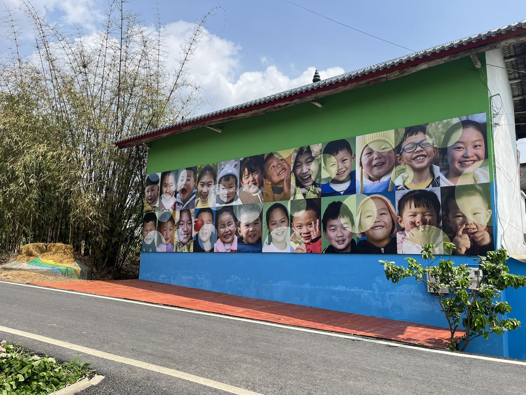 过去几年间,毛晓初持续在宝胜村拍摄,已经积累了大量影像素材,不过要做一场正式的展览,她还需要根据策展思路,有意识地补充一些展品。例如,她从村民手中搜集了一些老照片,放大、打印后陈列在村里合适的场所;她还拍摄了周边几乎所有孩子的笑脸,将工作室对面农房的墙壁刷成蓝绿两色,全部展示出来。