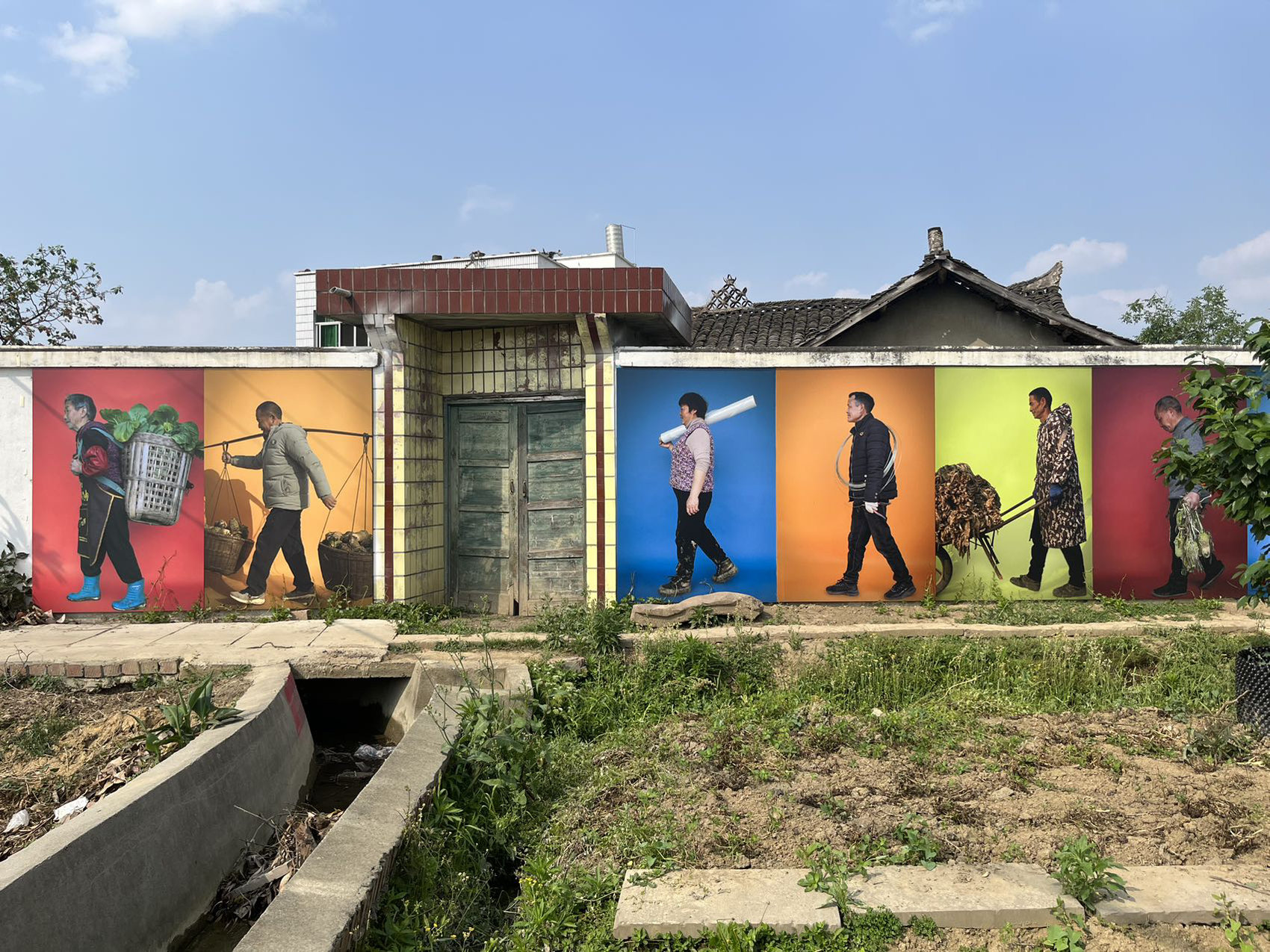 沿着村道徐徐前行,类似的作品在路边、门口、墙上、田间接连出现,不断给人带来惊喜。在一面院墙上,有一组8幅毛晓初拍摄的《行走的村民》,他们被置于不同颜色的背景前,有的正下地干活、有的准备去铺地膜、有的去拴葡萄架、有的劳动完毕回家,很多人裤脚、鞋面还沾着泥土,富有动感和生活气息。