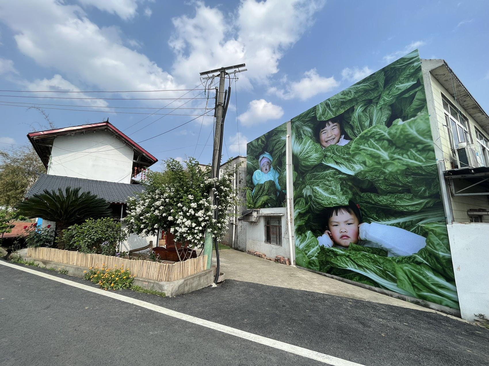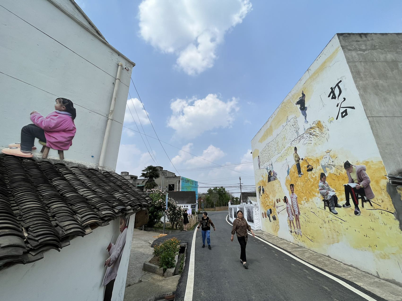路边的院墙上,6幅黑白照片率先映入眼帘,都是村民家中过去常用的老物件。两座二层楼房相对而立,一边墙上画满金灿灿的稻谷,十余个小朋友的照片穿插其中,有的读书、有的玩耍,名为“谷堆中的孩童”;另一边墙上也有两个孩子的剪影,其中一个女孩的坐像被陈列在高处,如同突然从瓦房上冒出,饶有趣味。