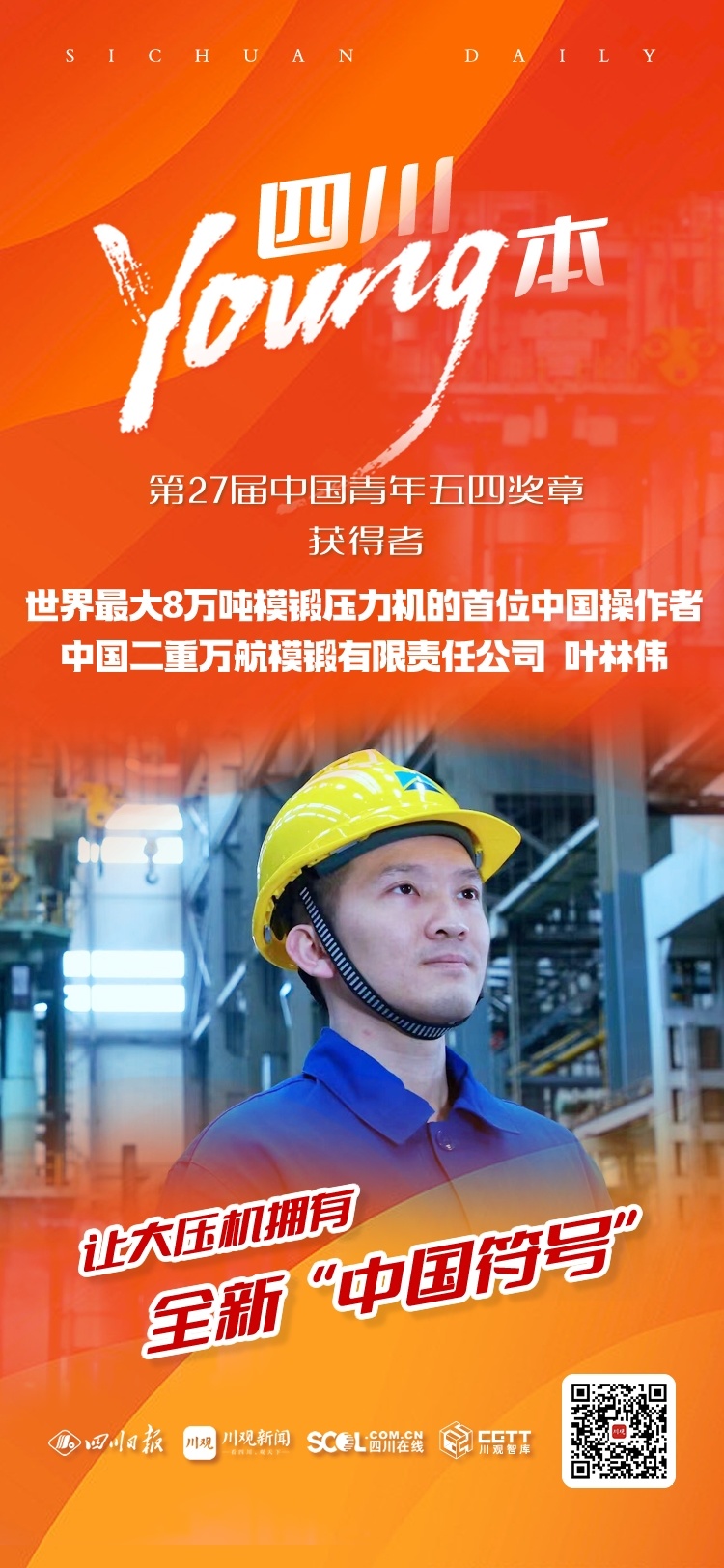 叶林伟,中共党员,国机集团中国二重万航模锻模锻工、班组长。曾获中央企业青年岗位能手、C919首飞个人二等功、四川青年五四奖章、德阳榜样等荣誉。在工作的14年时间里,他锤炼精湛技艺,精准操控世界最高等级8万吨模锻压力机,成功压制首件C919大型客机缘条精密钛合金锻件等高端精密模锻件,服务国家重大工程项目建设,以高超技能助力制造大国向制造强国迈进。今年,叶林伟被授予第27届中国青年五四奖章。